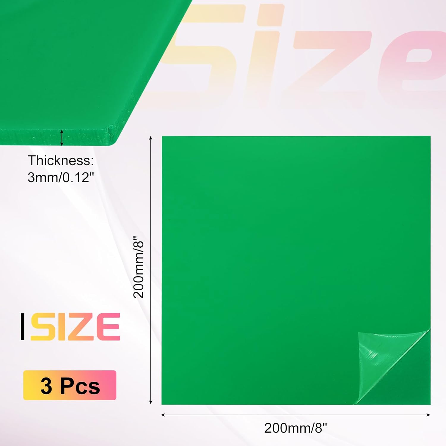 - Color:Green;Size: 200x200mm/8 x 8 Inch (L*W);Thickness:3mm/0.12 inch;Material: Acrylic;In the package of: 3Pcs x colour plastic sheets.