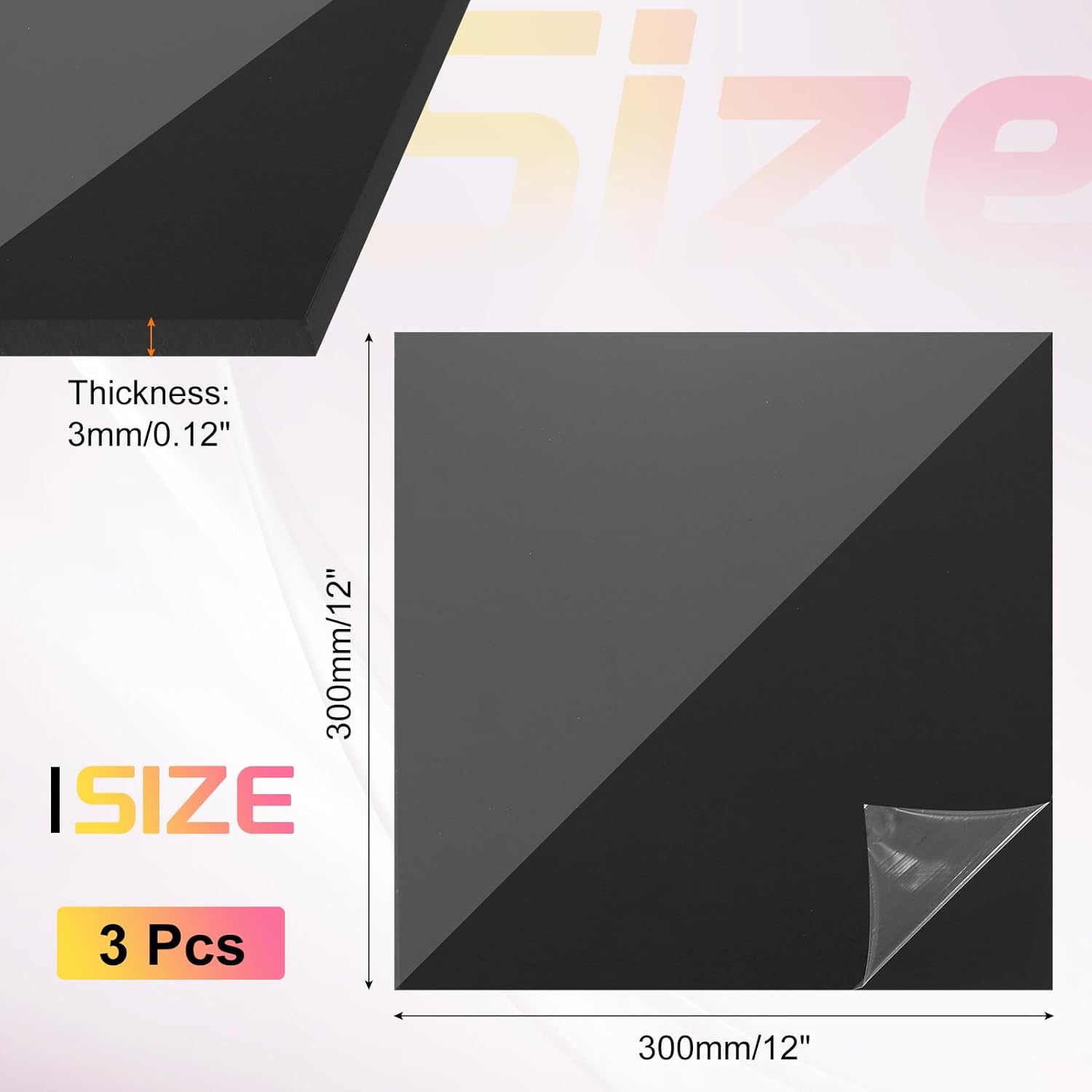 - Color:Clear Black;Size: 300x300mm/12 x 12 Inch (L*W);Thickness:3mm/0.12 inch;Material: Acrylic;In the package of: 3Pcs x colour plastic sheets.