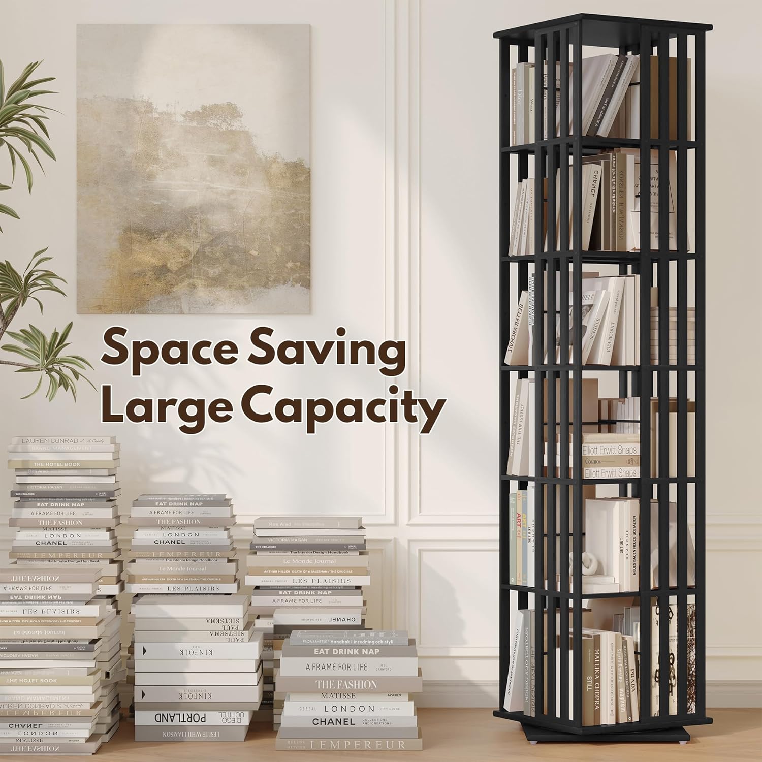 YOWOS Rotating Bookshelf Tower, 360 Display Spinning Bookcase, Bamboo Bookshelf Floor Standing Storage Rack, Wood Narrow Book Shelf Organizer for Kids&Adults (Black, 6 Tier)
