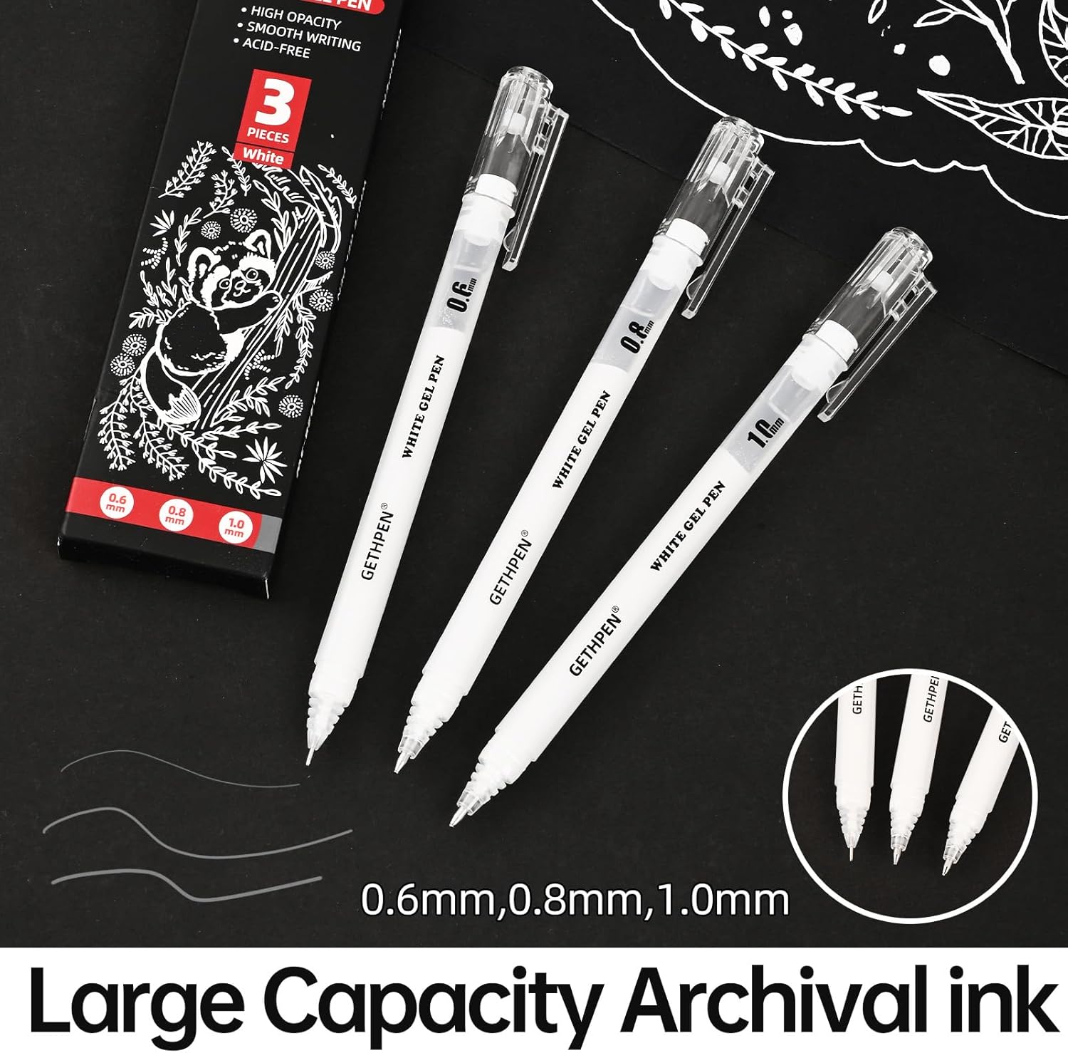 - 0.6mm/0.8mm/1.0mm WHITE GEL PENS FOR ART: 0.6mm for ultra-fine bullet journaling, 0.8mm for smooth writing, and 1.0mm for bold art accents. The opaque white ink creates stunning contrast on dark papers, perfect for holiday cards or sketch details that demand attention