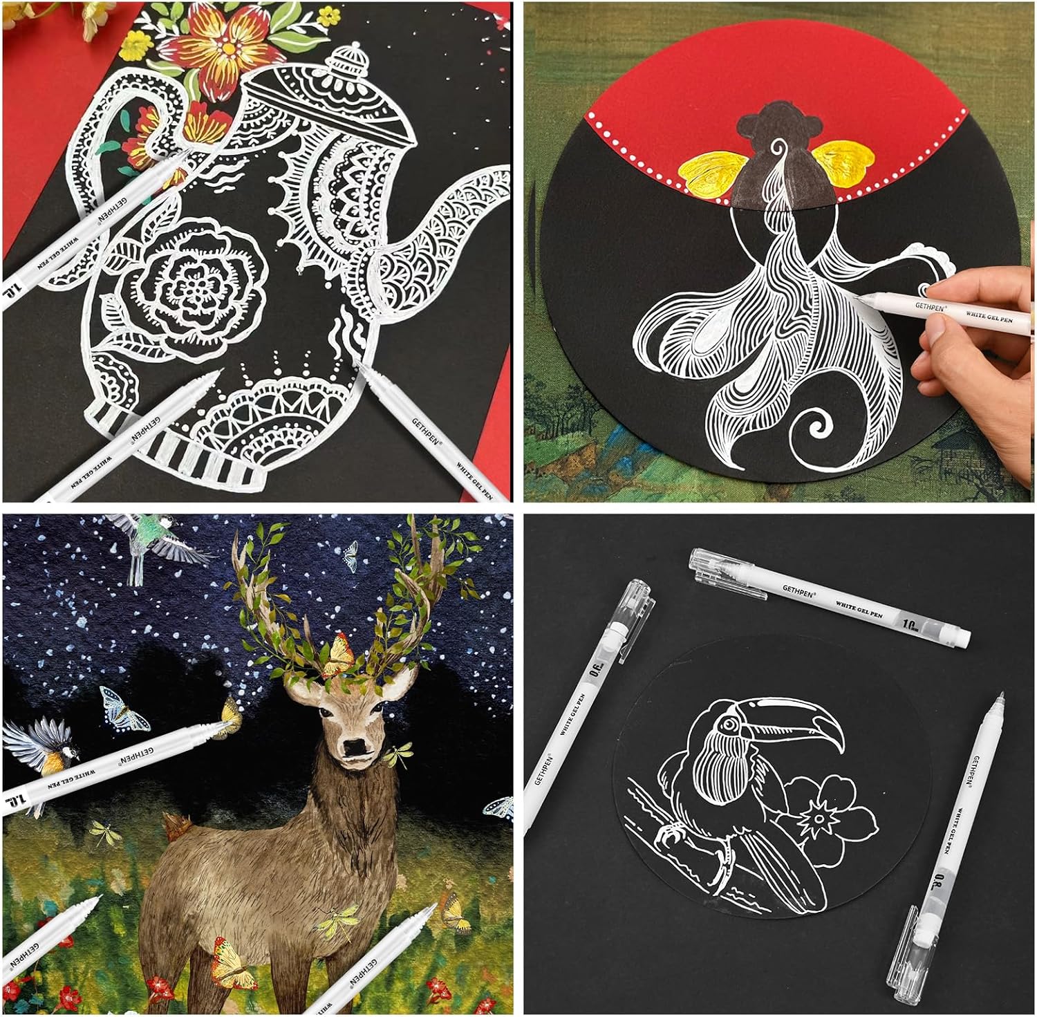 - MULTI-PURPOSE: Transform black paper, craft cards, and colored journals into vibrant masterpieces. These White Gel Pens deliver crisp, skip-free lines for Halloween decorations, Christmas gift tags, and intricate illustration work that pops against dark backgrounds