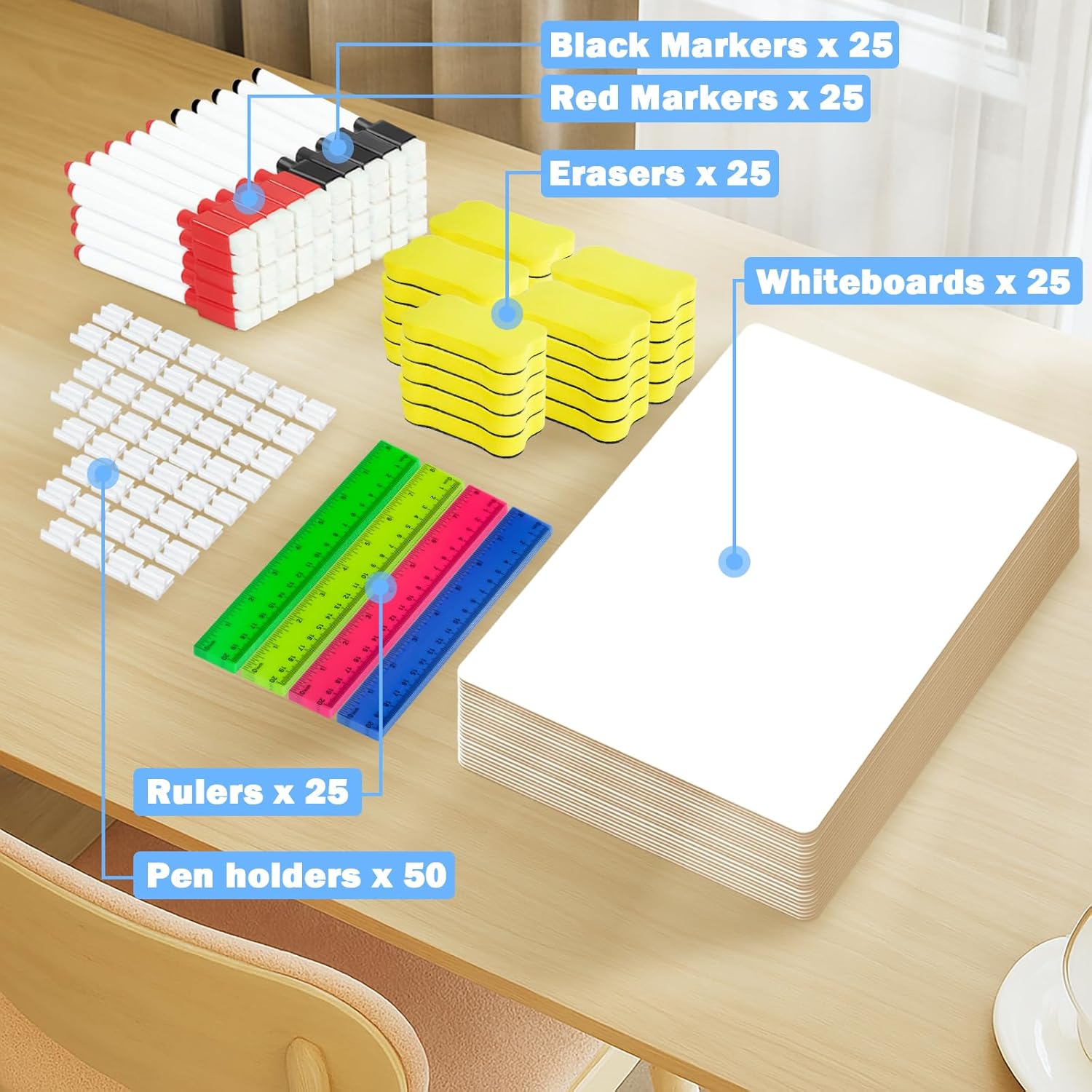 - High Value Complete Set: This dry erase boards set includes 25 whiteboards, 25 erasers, 25 black markers, 25 red markers, 25 rulers, and 50 pen clips. Itβs the perfect all-in-one solution for classrooms, homes, and offices, offering great value for your money