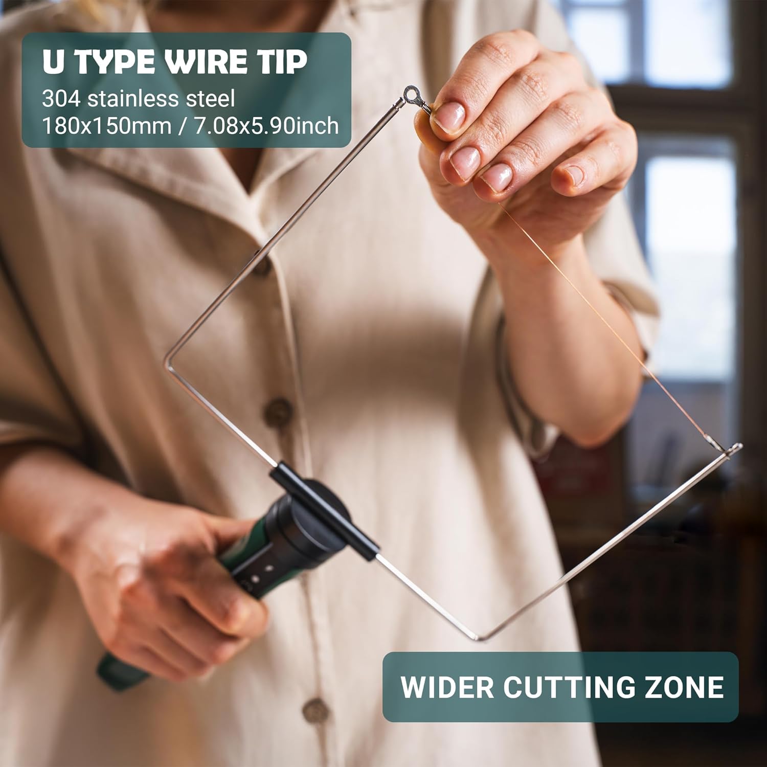 - Package includes: 1x Handle,1x 2"(5cm) Straight blade,1x 4"(10cm) Straight blade,1x 7"(18cm x 15cm) U-type hot wire tip,1x 7"(18cm x 15cm) F-type hot wire tip, 5x 7"(18cm) Replacement Wire, 1x Power supply, 1x Scraper, 1x Support Frame, 1x Table fixation, User Manual, Warranty Card