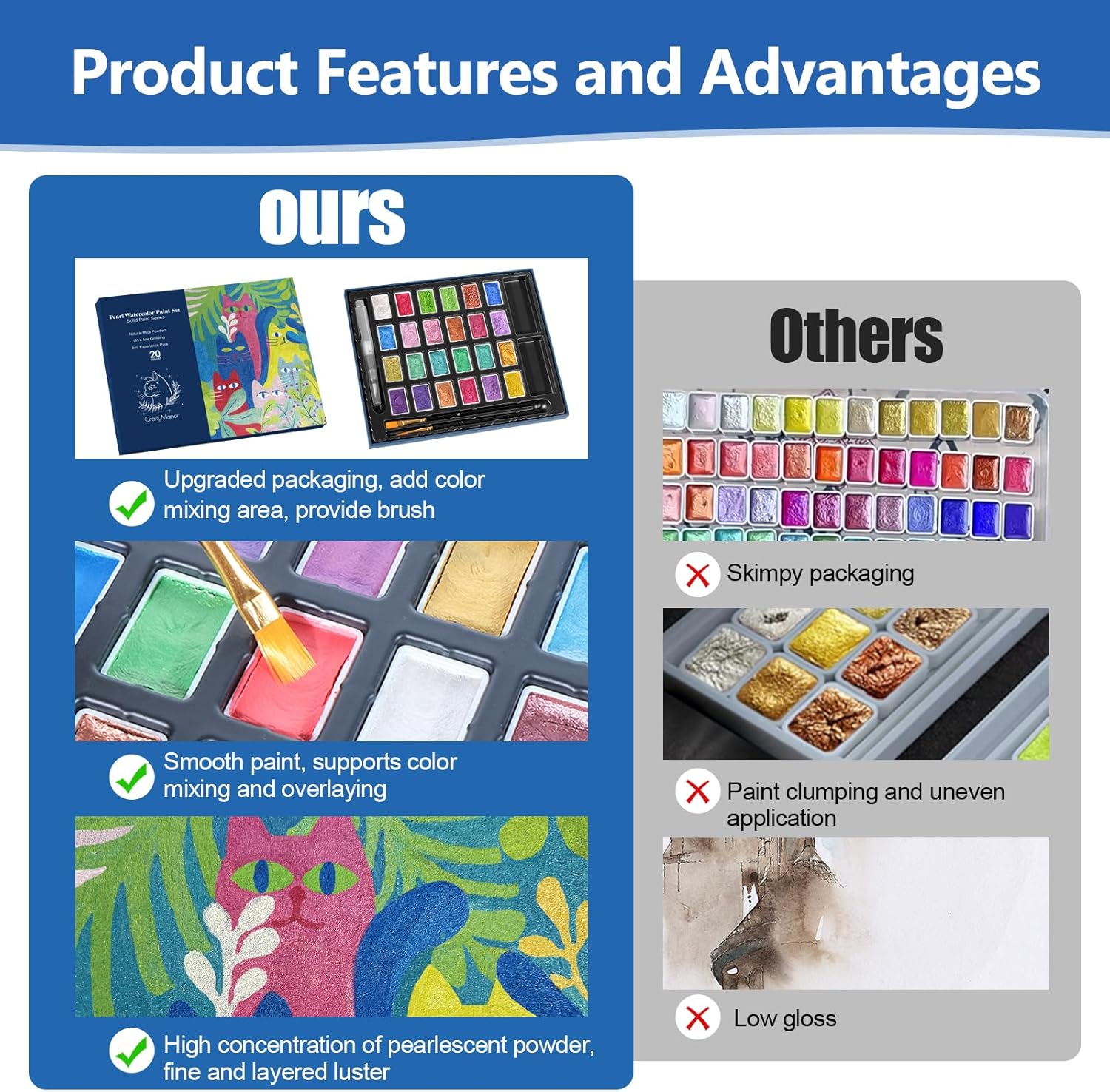 - 【Exceptional Shimmering Texture】CraftyManor pearlized water color paint sets for kids are formulated with premium, modified mica powder, resulting in a stunningly glossy finish. Free of acids and toxins, the watercolor sets are safe to use and will add a radiant touch to your art work