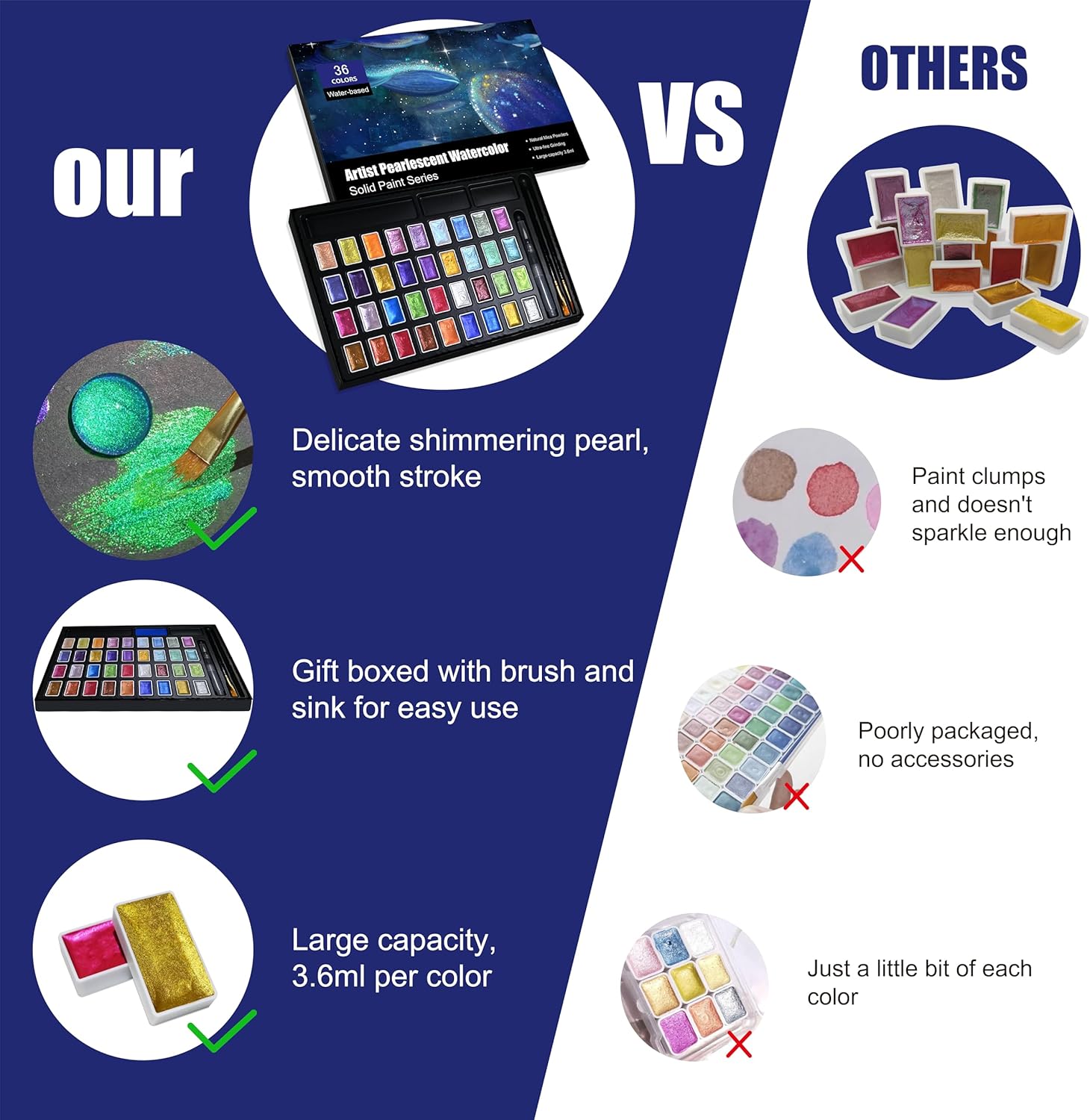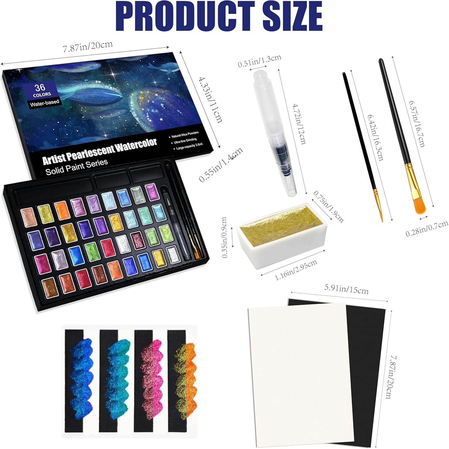 Shimmer Watercolor Paint Set, 12 Colors Glitter Metallic Watercolour Painting Sets, Solid Pearl Water Color Paints for Artists, Amateur Hobbyists and Painting (36 Colors)