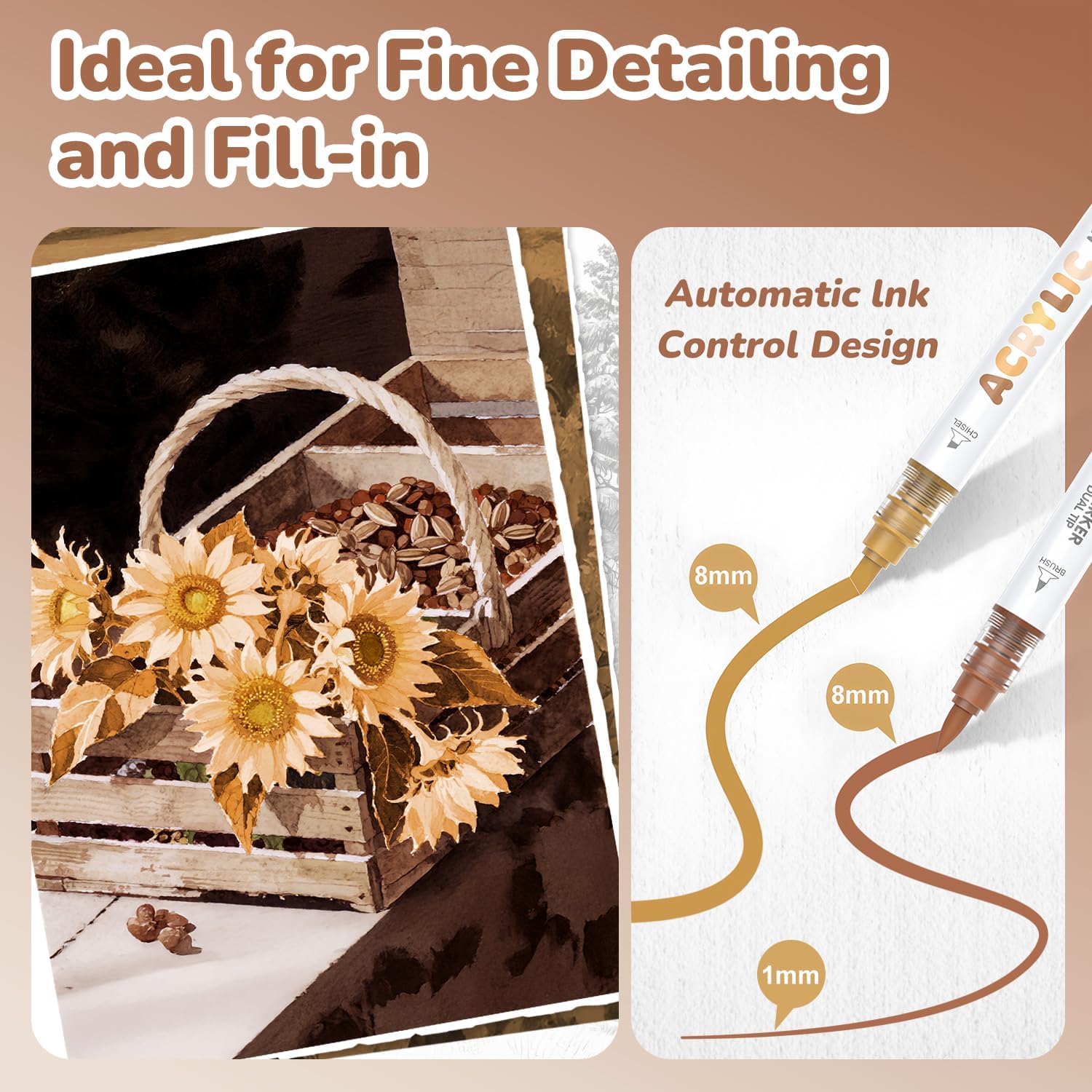 Guangna 12 Brown Dual Tip Acrylic Paint Markers, Brush Tip & Chisel Tip Acrylic Paint Pens for Rock, Wood, Glass, Paper, Coloring Book, Ceramic, Canvas, Water-Based Ink
