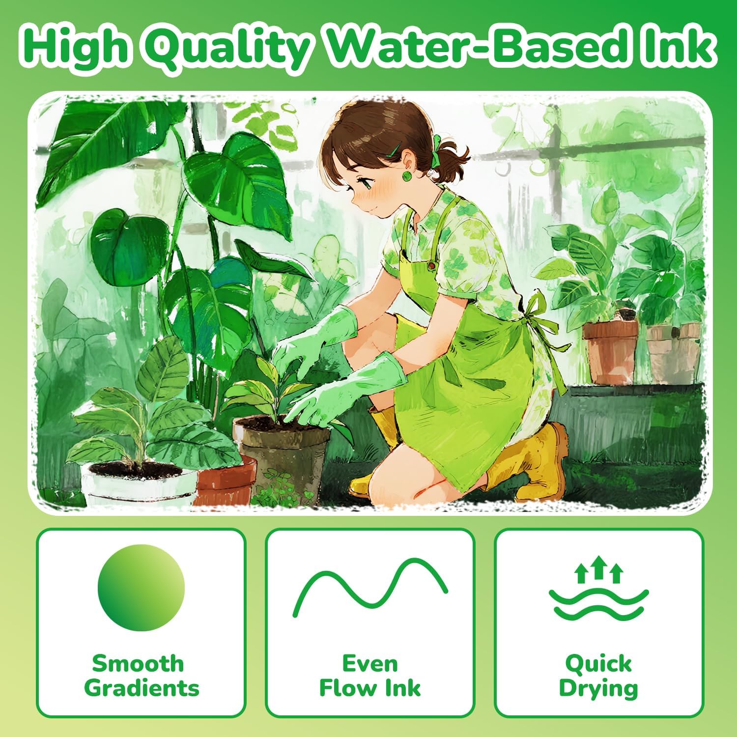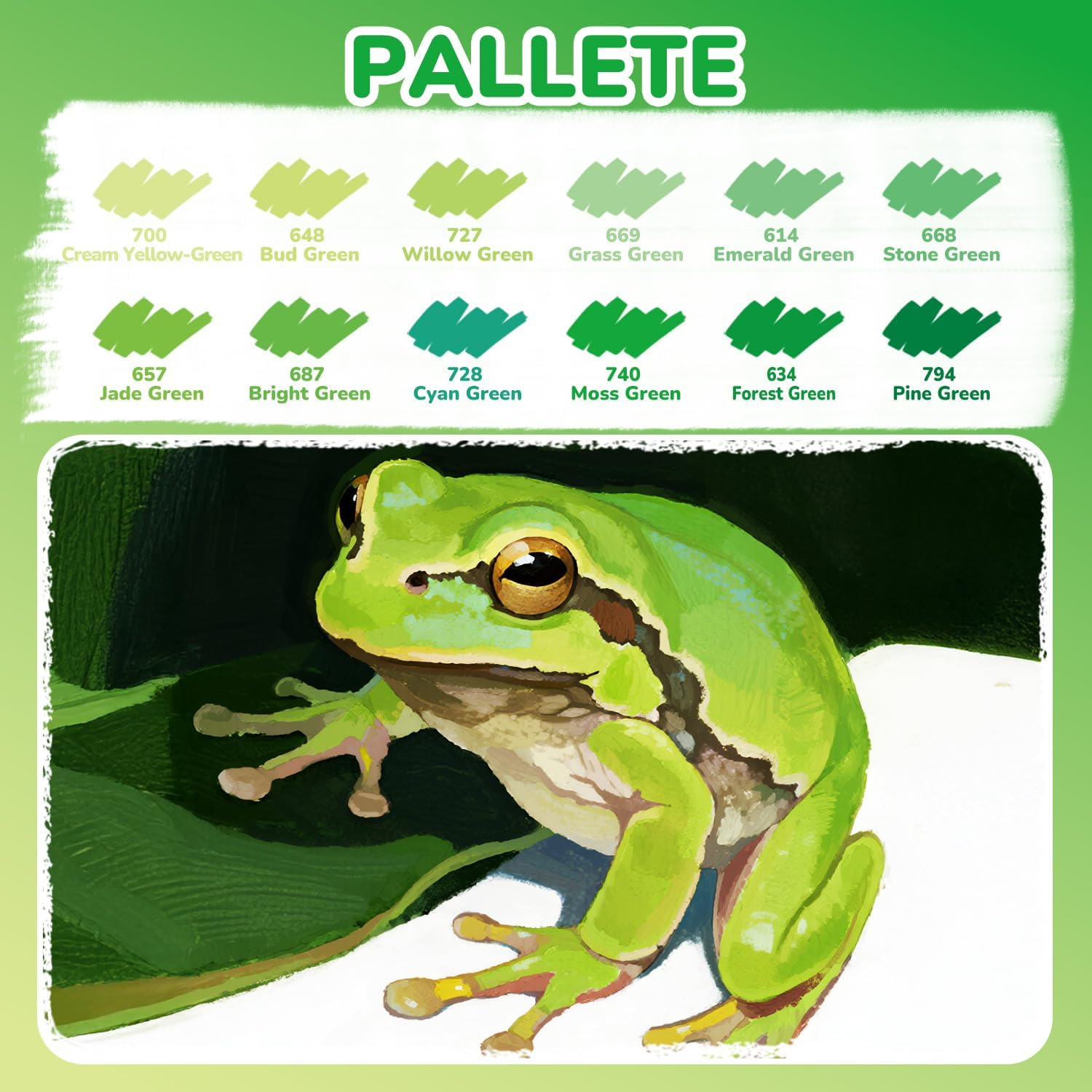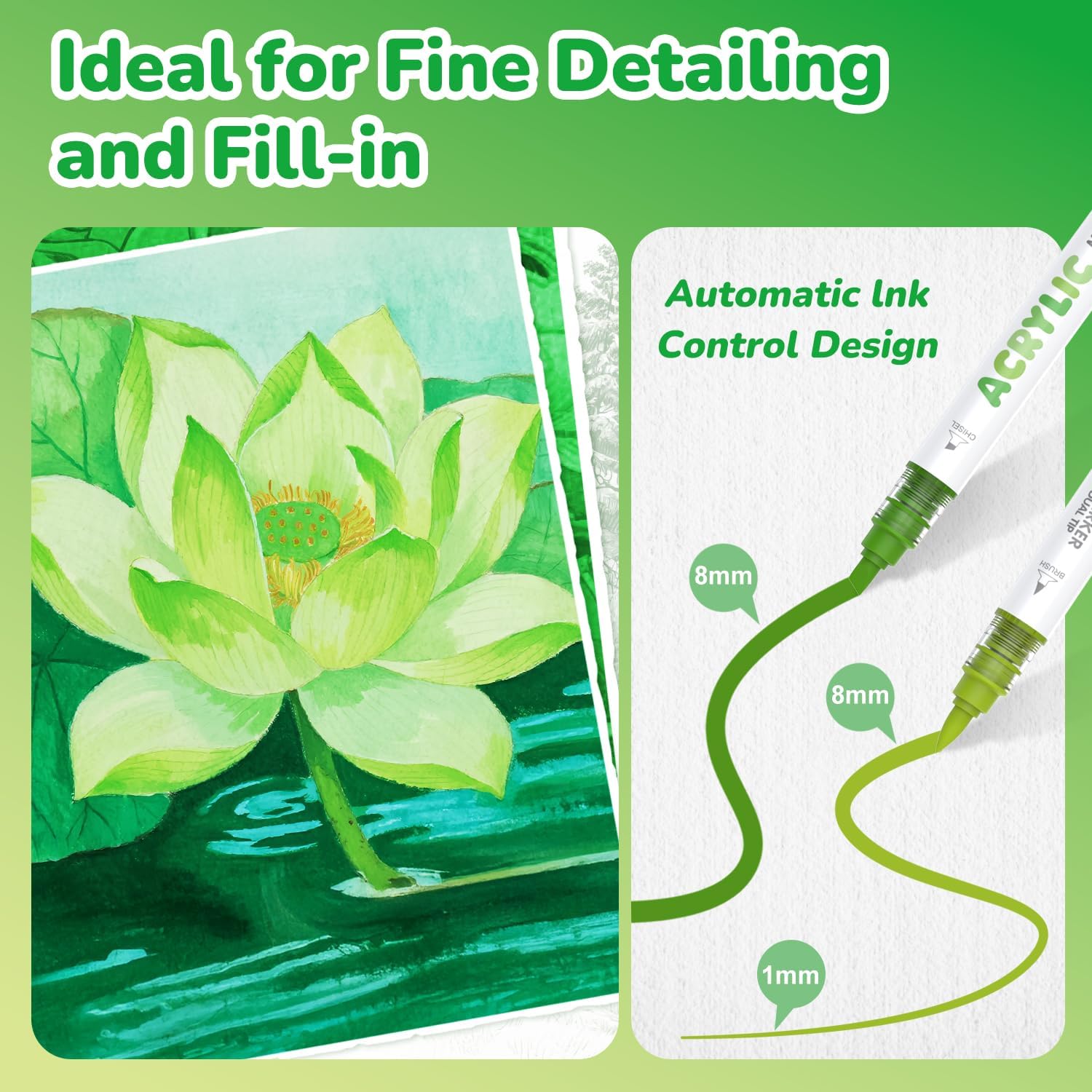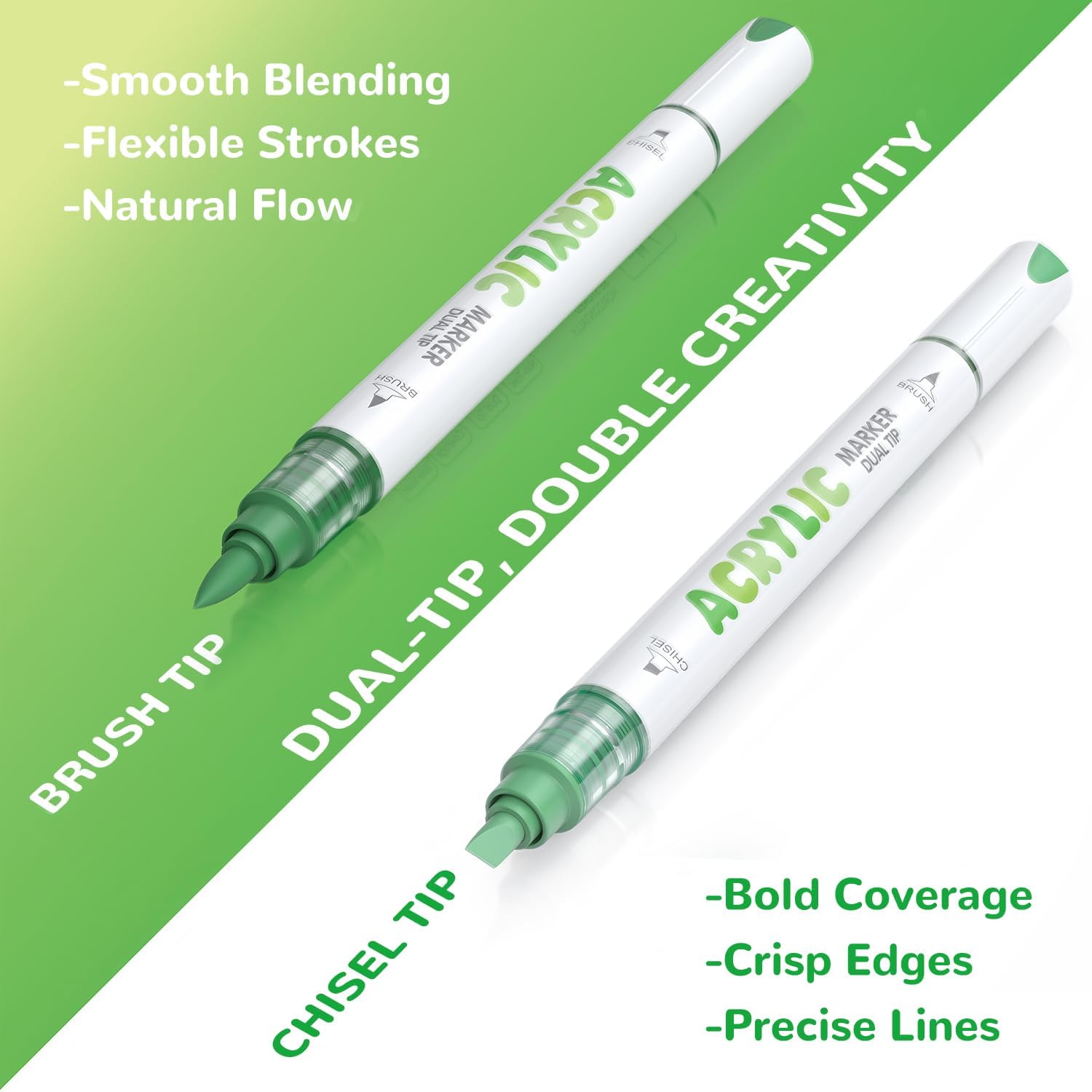 Guangna 12 Green Dual Tip Acrylic Paint Markers, Brush Tip & Chisel Tip Acrylic Paint Pens for Rock, Wood, Glass, Paper, Coloring Book, Ceramic, Canvas, Water-Based Ink