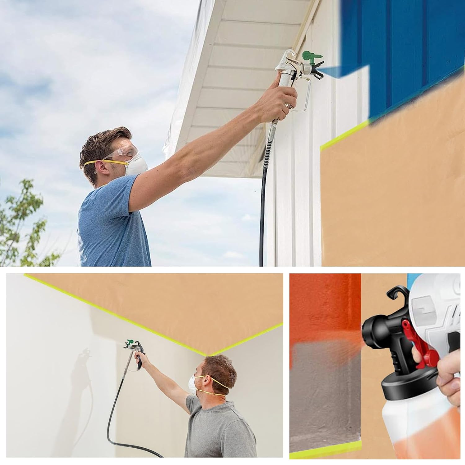 - 【Strong, Non-absorbent】 Our pre-taped painters paper is made of 40gsm machine glazed brown kraft paper, it resists tearing and high penetration resistance, offers stronger protection than plastic masking film in house painting.