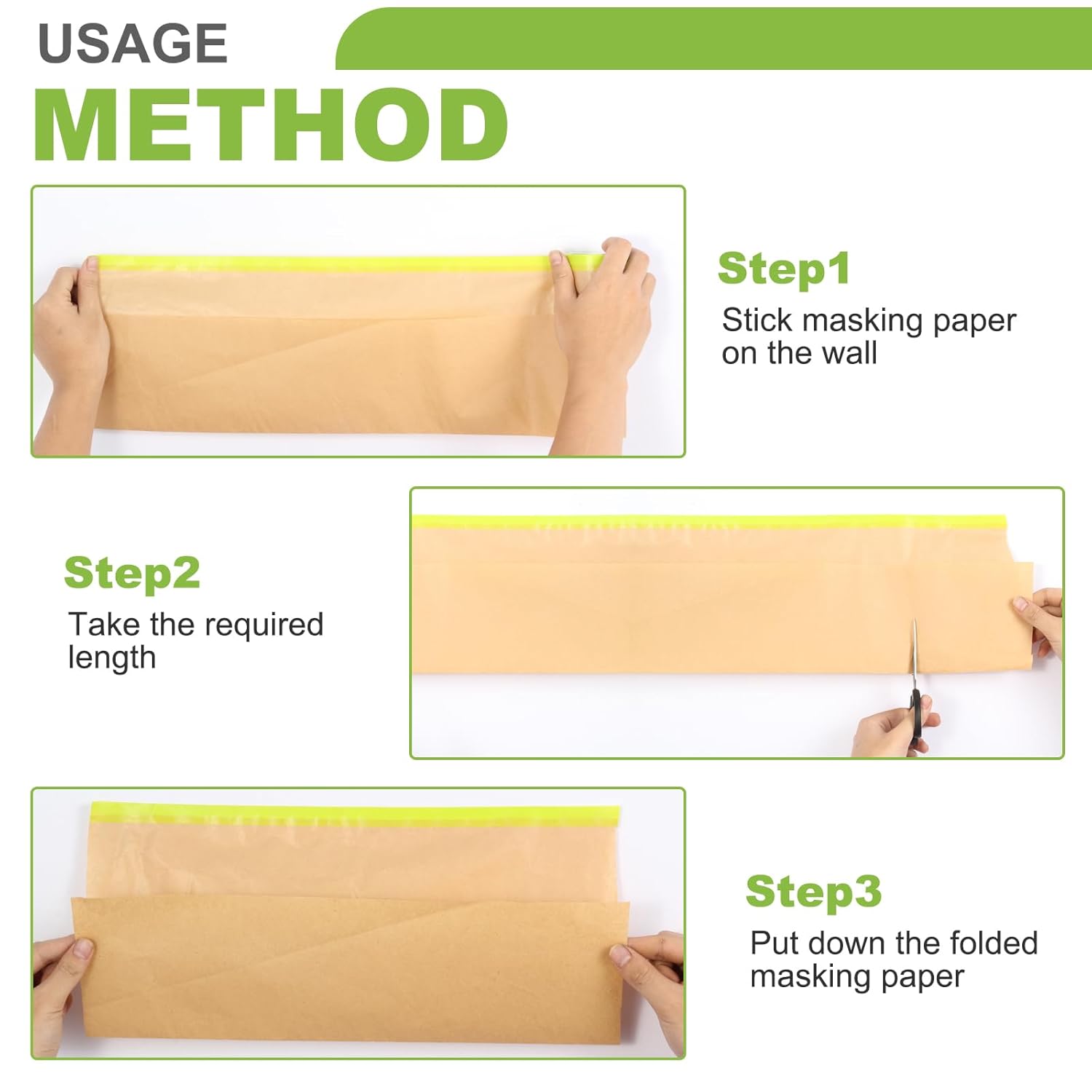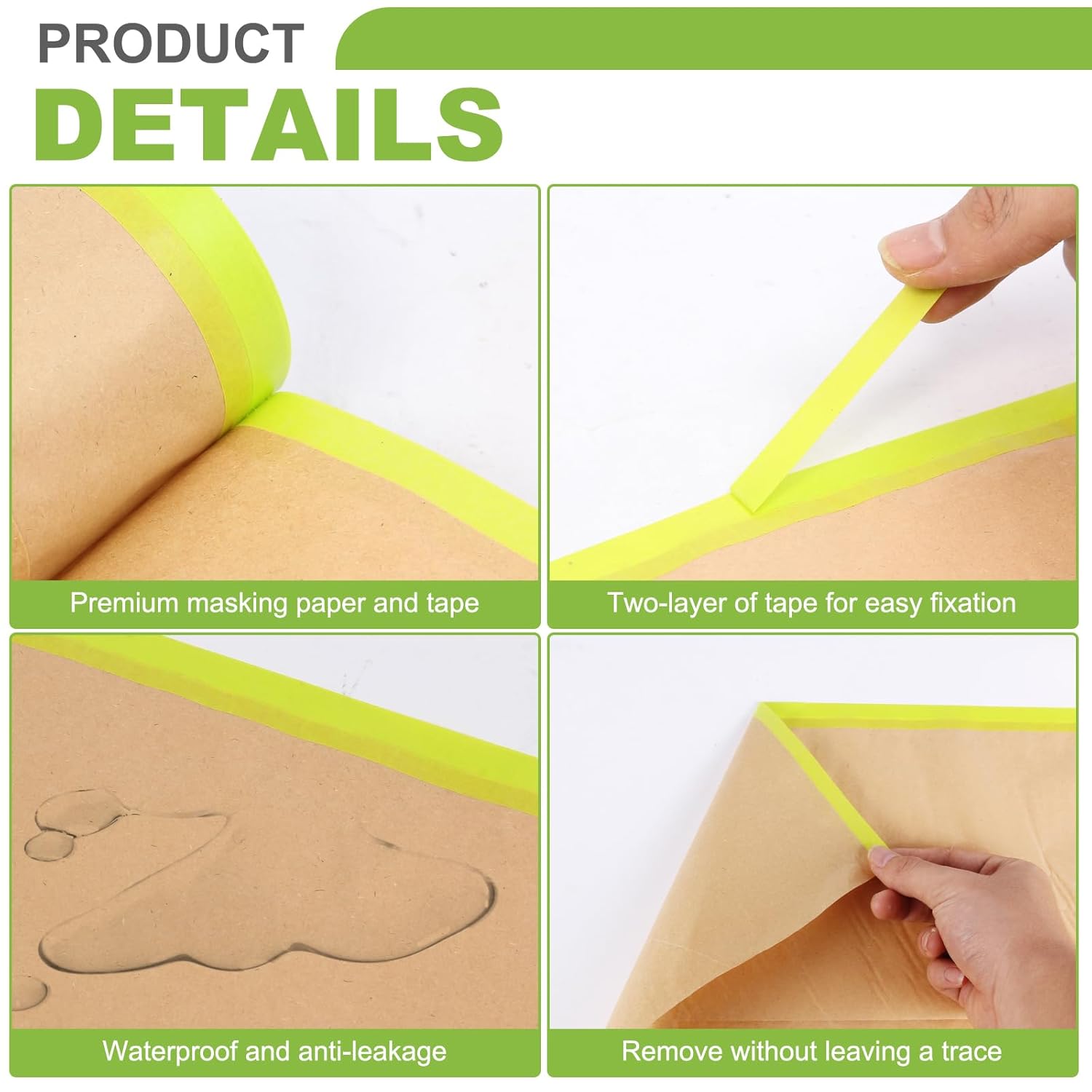 - 【Strong, Non-absorbent】 Our pre-taped painters paper is made of 40gsm machine glazed brown kraft paper, it resists tearing and high penetration resistance, offers stronger protection than plastic masking film in house painting.
