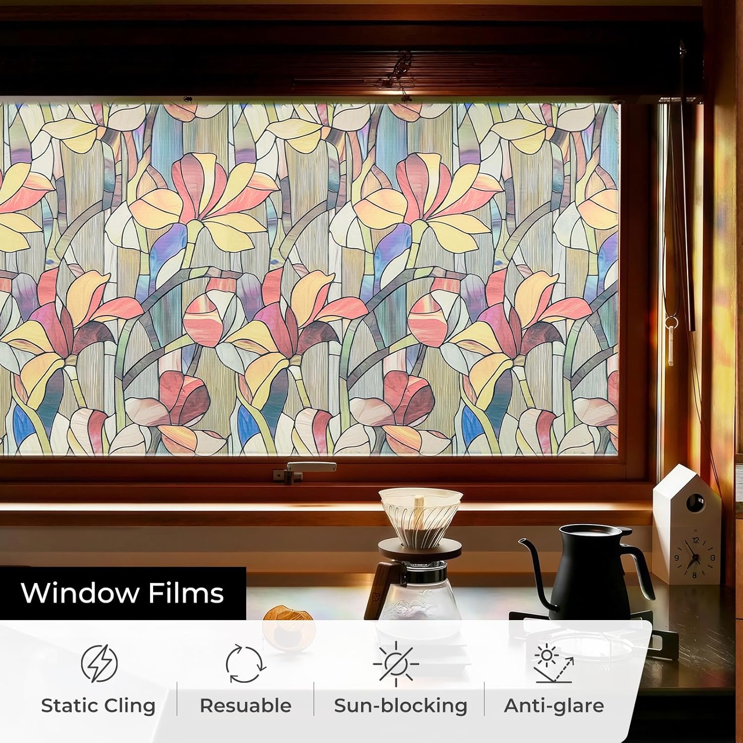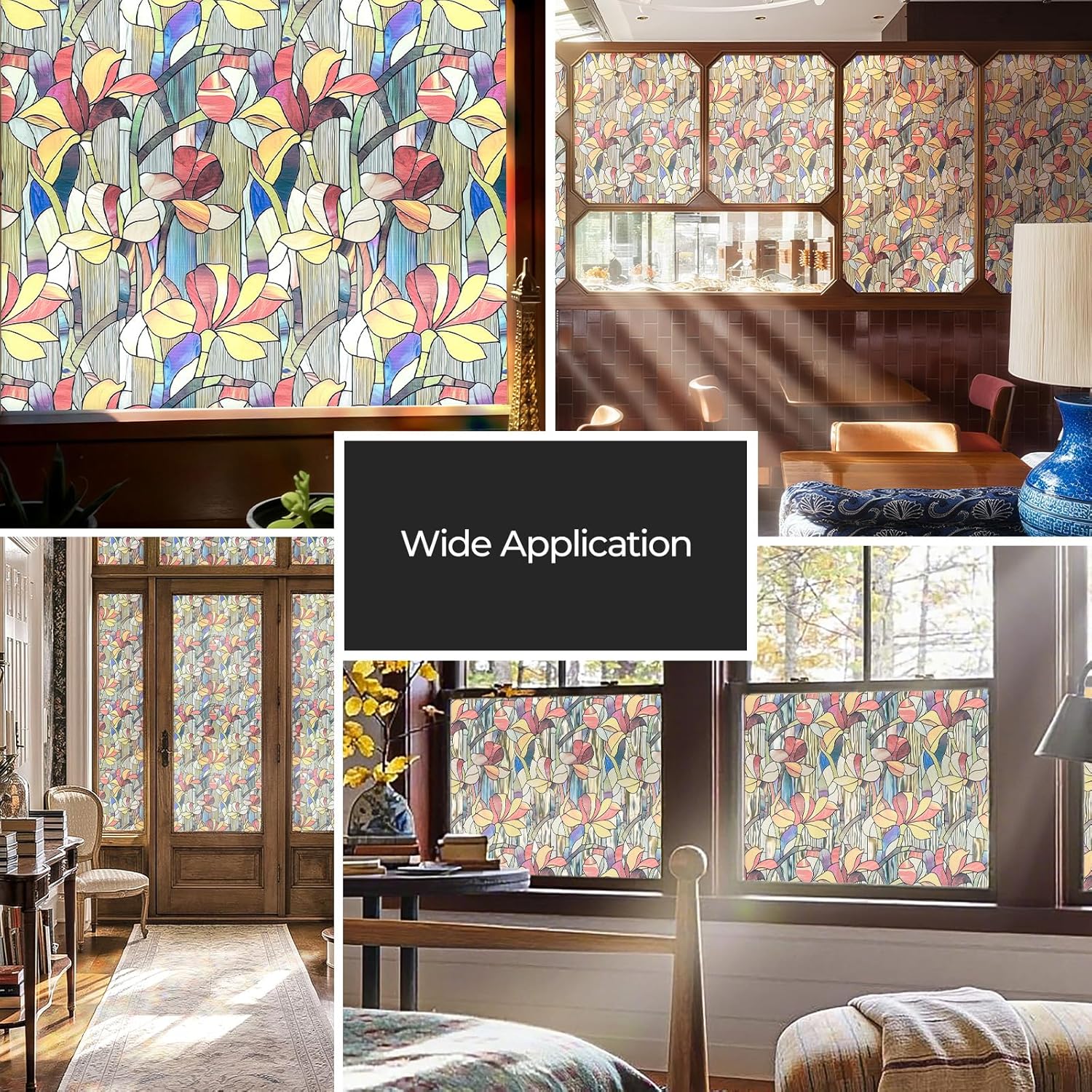 - Easy Installation and Adhesive-Free: Our stain glass film installs easily, no glue needed. Just measure, cut, and apply with water on clean glass. It's residue-free for easy repositioning or removal whenever you want a new look.