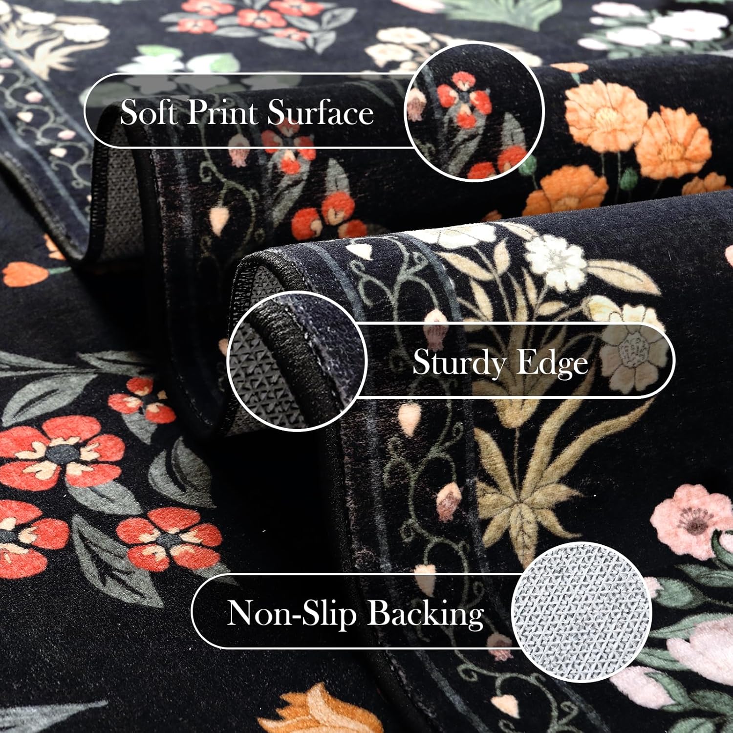 - Style Heart of Your Space: Against light walls, a black floral rug becomes an eye-catching centerpiece. Paired with wood, plants, it creates a relaxed bohemian vibe. If your sofa is bright or bold, this rug adds balance and depth to the space
