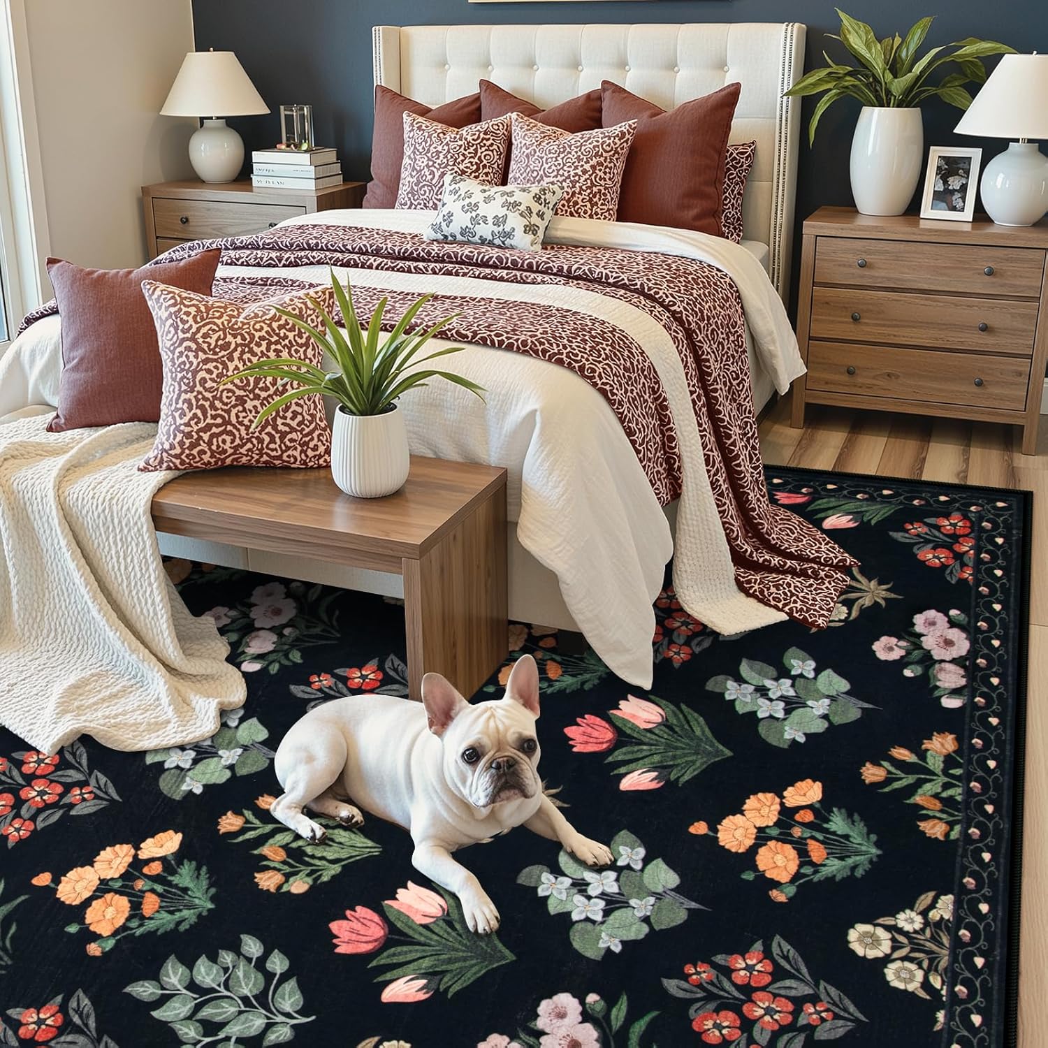 - Style Heart of Your Space: Against light walls, a black floral rug becomes an eye-catching centerpiece. Paired with wood, plants, it creates a relaxed bohemian vibe. If your sofa is bright or bold, this rug adds balance and depth to the space