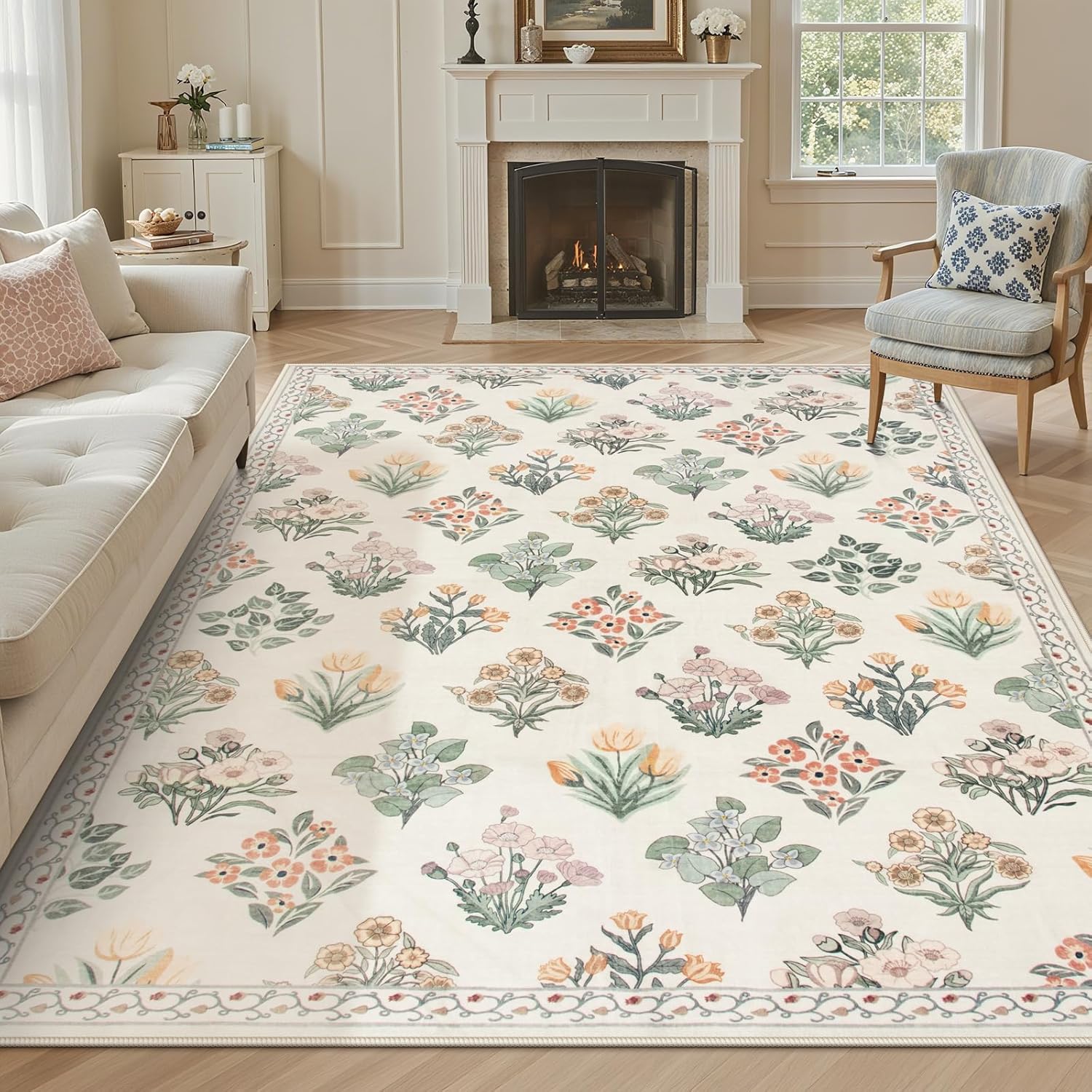 Wonnitar Floral Washable 8X10 Area Rugs, Soft Large Rugs for Living Room, 8 x 10 Low Pile Non Slip Moroccan Bedroom Carpets for Nursery Kids Room Decor Dining Room, Cream Beige
