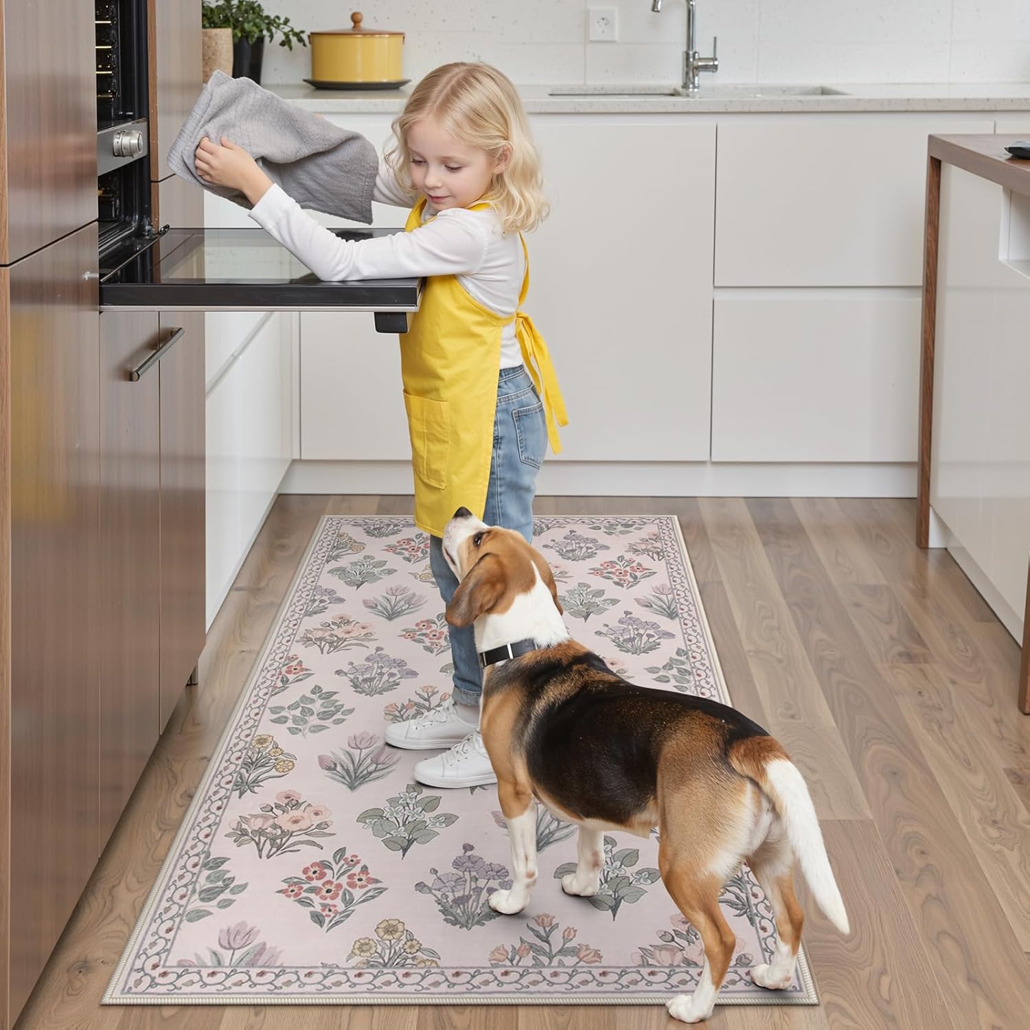 Wonnitar Boho Floral 3x5 Washable Rug, Ultra-Thin Pink Small Rugs for Bedroom, Soft Non Slip Moroccan Throw Carpet for Nursery Girls Bedside Dorm Room Decor, Pale Pink