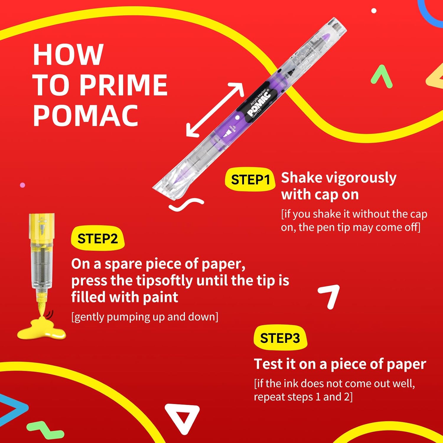- Brush & Fine Dual Tips: POMAC water-based acrylic paint pens feature a dual tip design, where the Fine tip allows for a 0.5mm line or a 4mm thickened line, perfect for sketching or filling in large areas. the soft tip on the other end allows you to draw lines from 1-6mm depending on the pressure of the pen tip for more flexibility. all you need to do is get inspired and make your work shine on any surface.