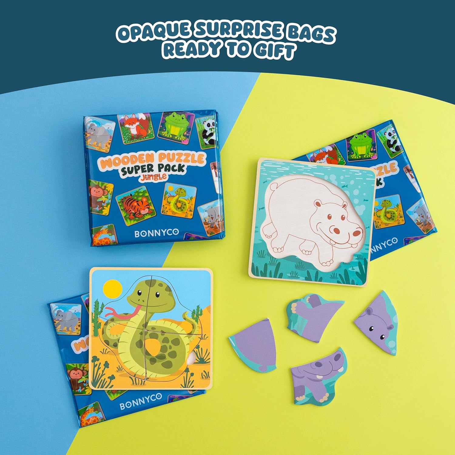 BONNYCO 4 Pieces Wooden Puzzles Pack 16 Party Favors for Kids 1 to 5. Birthday Goodie Bags Stuffers, Valentines Gifts for Toddlers Ideas, School Classroom Prizes and Baby Bulk Toys