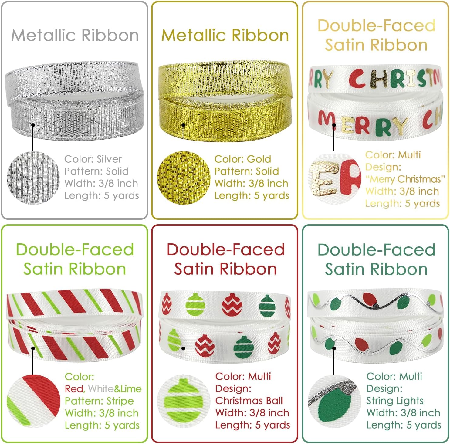 MEEDEE Christmas Ribbon 3/8 inch Thin Holiday Ribbon Set in Red, Green, White, Gold & Silver Color 12 Rolls 60 Yards Perfect for Gift Wrapping, Xmas Wreath Decor, Garlands, and Holiday Crafts