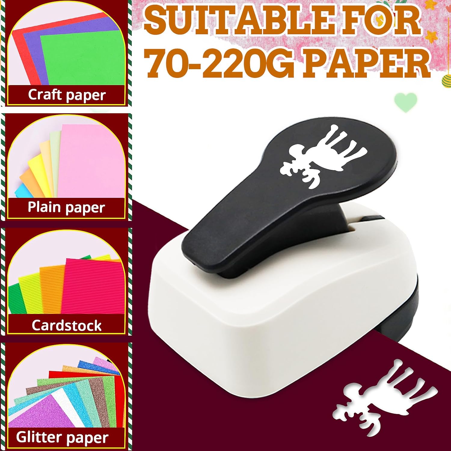 - Various Paper: The Christmas deer shape punch 1 inch is suitable for 70g-220g plain paper, cardstock, craft paper and glitter paper. Paper thickness is generally less than 2MM