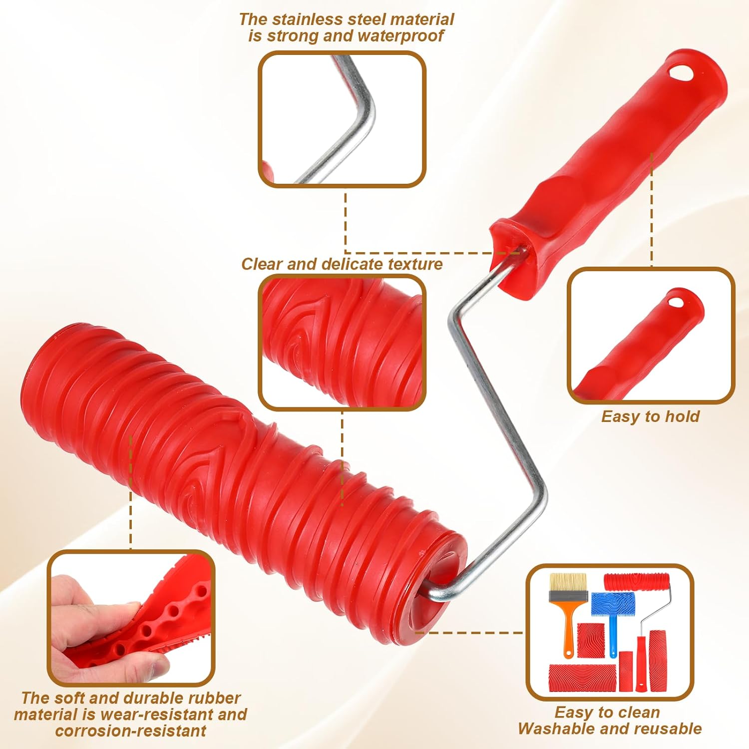 - Value Packaging: Includes 1 7-inch woodgrain roller with handle, 1 4-inch woodgrain rocker with handle, and 4 woodgrain rubber tools (3-inch, 4-inch, 5-inch, 6-inch), 1 x paint brush