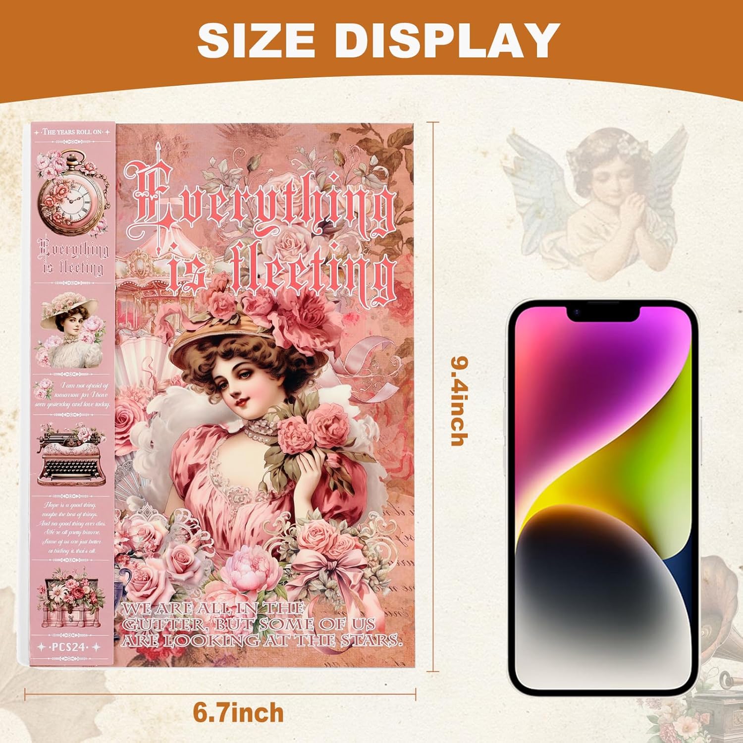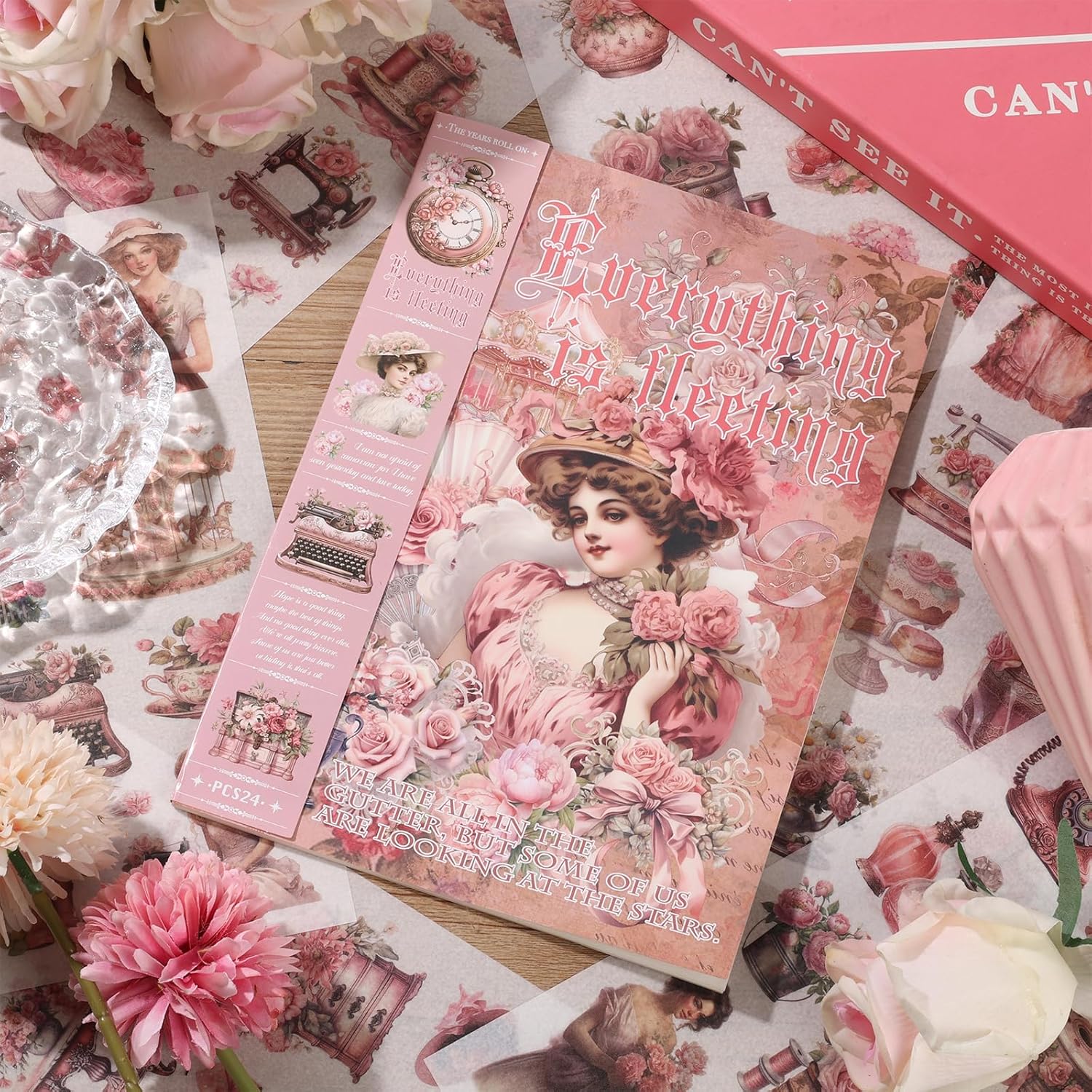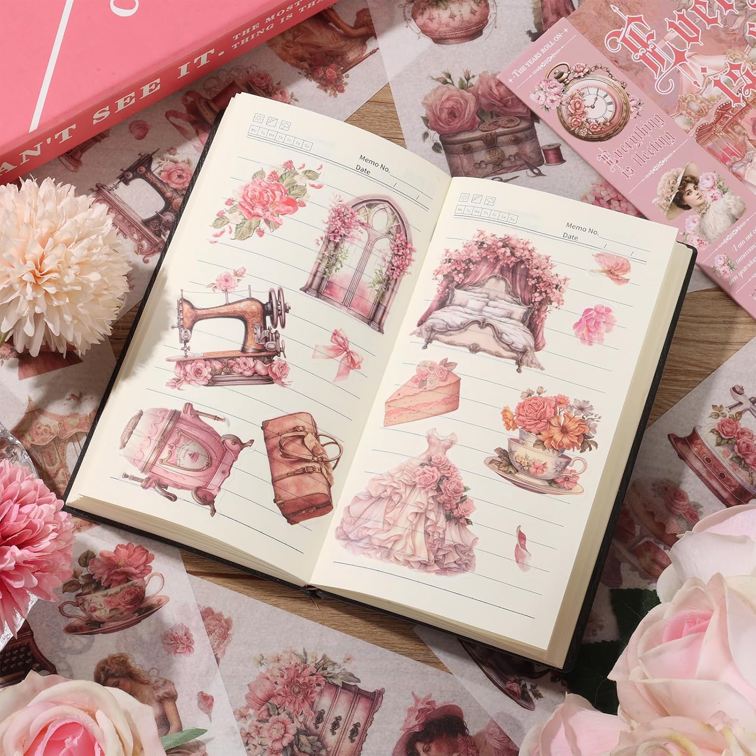 - Our vintage scrapbook stickers feature a variety of designs, including women, girls, pink flowers, clocks, carriages, cakes, sewing machines, houses, and more. You can use these stickers to make your scrapbook pages more personal. They add color, texture, and visual interest, making your scrapbook look even better.