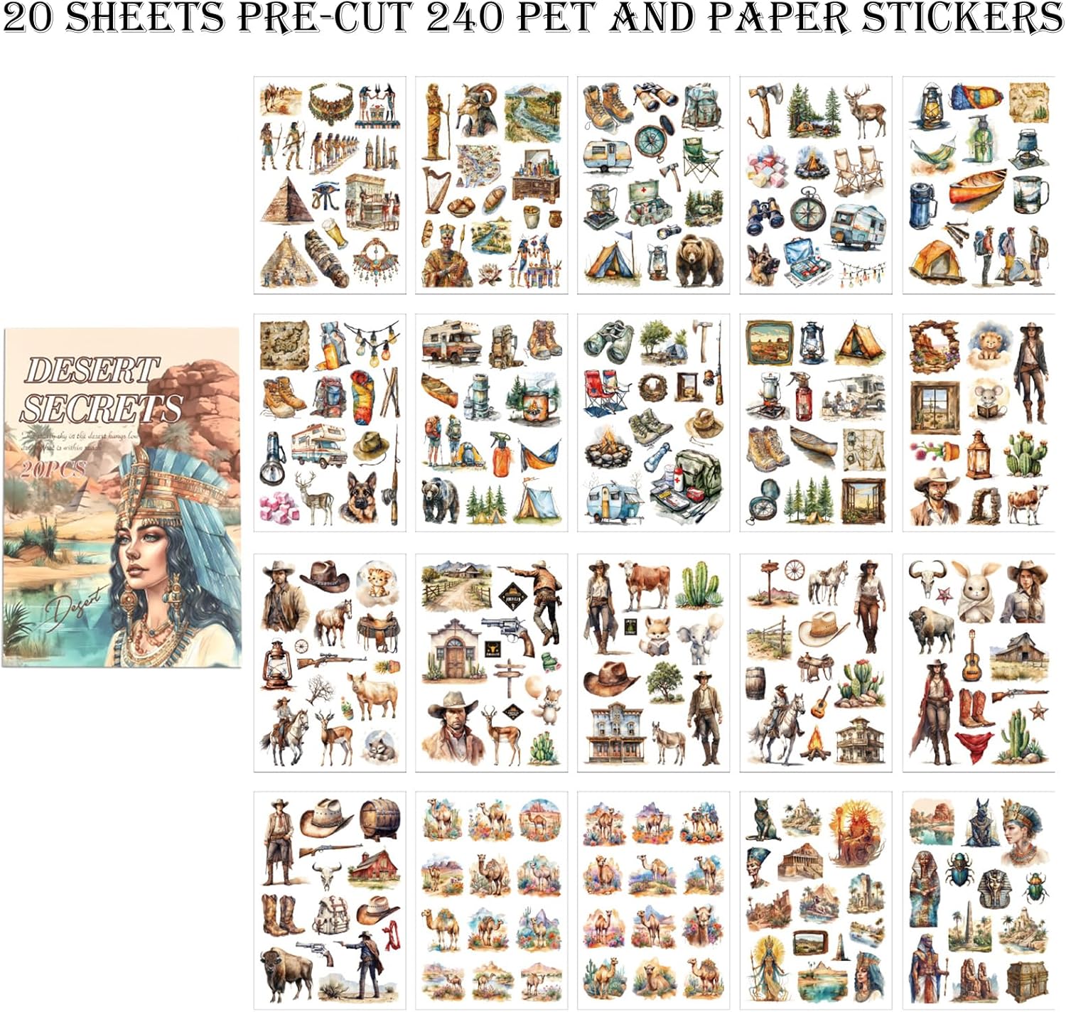 Egypt Travel Scrapbook Stickers 20 Sheets 240 Pre-Cut Washi Stickers PET Transparent Desert Book Sticker for journaling Decorative or DIY Paper Crafts Arts and Crafting Projects