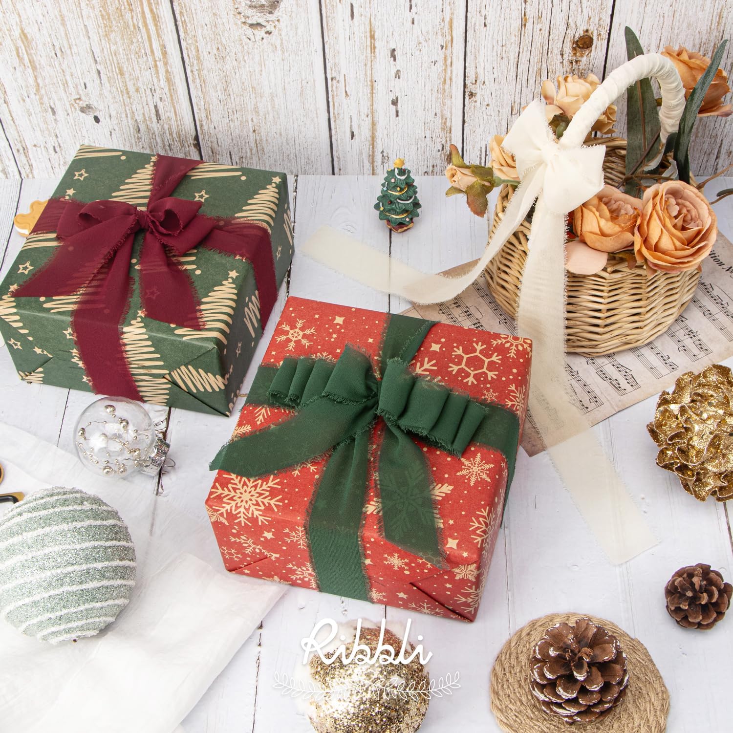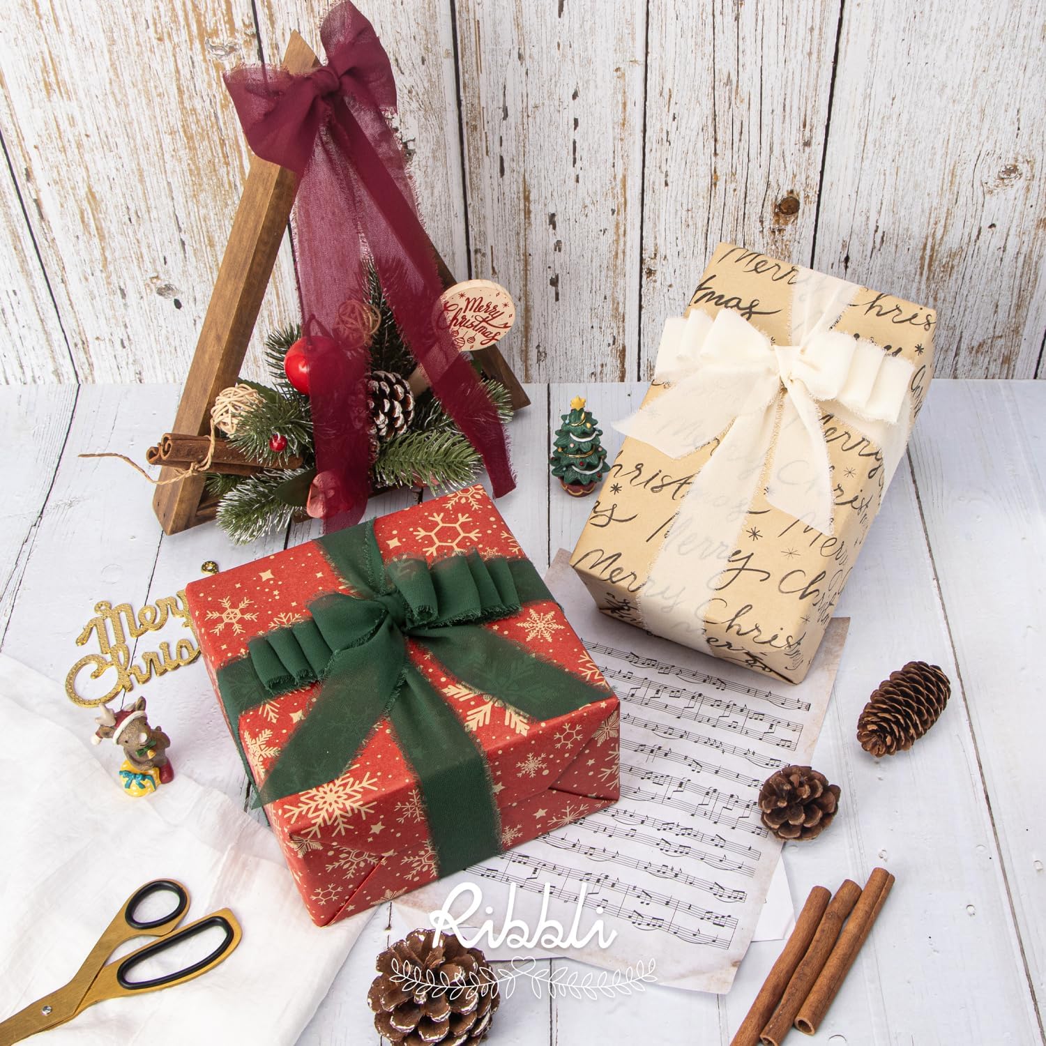 Ribbli Red Cream Green Christmas Ribbon 1.5 Inch x 3 Rolls Total 30 Yards Handmade Fringe Chiffon Silk Ribbon for Gift Wrapping DIY Crafts Home Decor