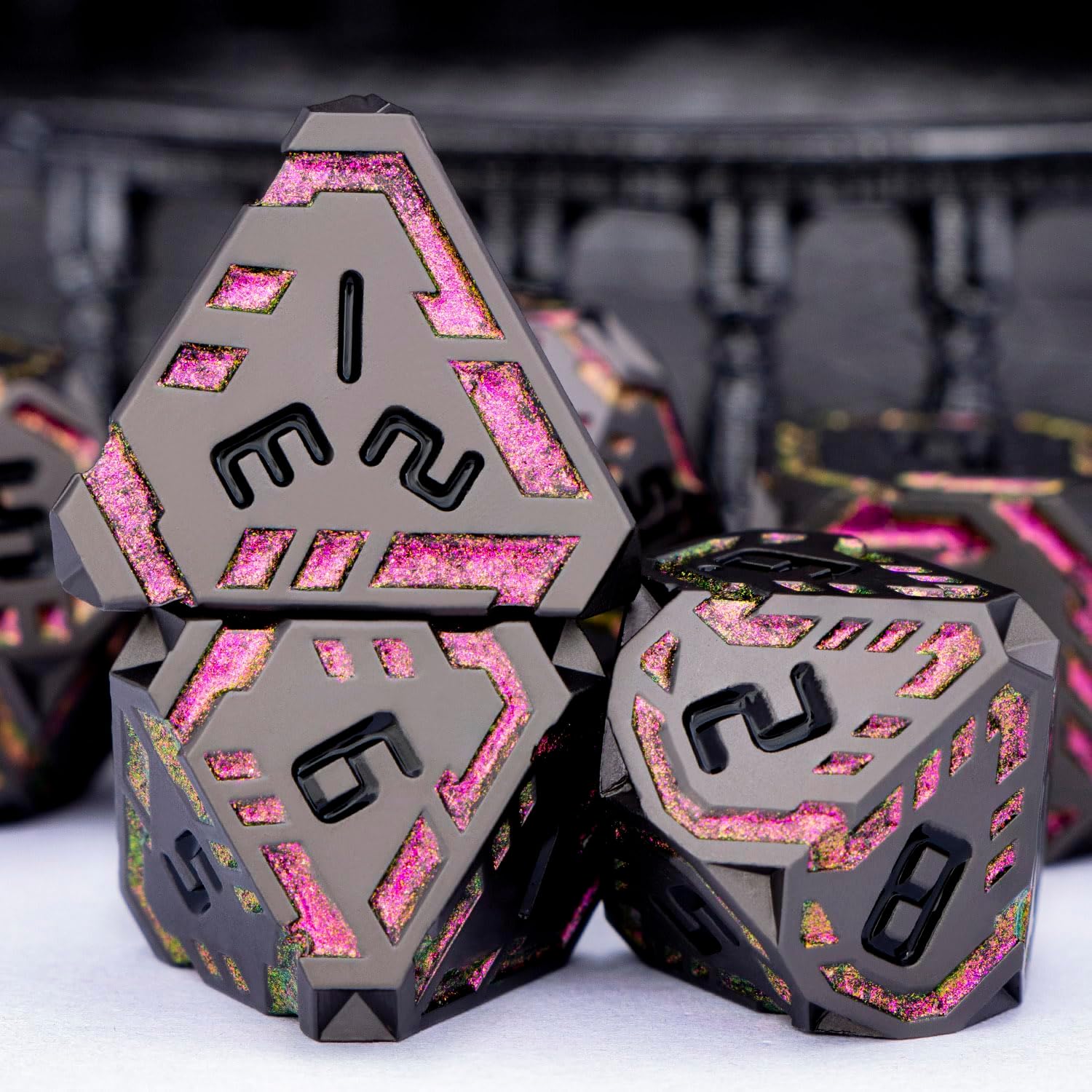 Metal DND Sci-fi Dice Set 7PCS Stripe Polyhedral Dice for Dungeons Dragons RPG Role Playing Game, Glitter D and D Dice with Gift Box D6 D8 D10 D12 D20 (Black&Purple Red)