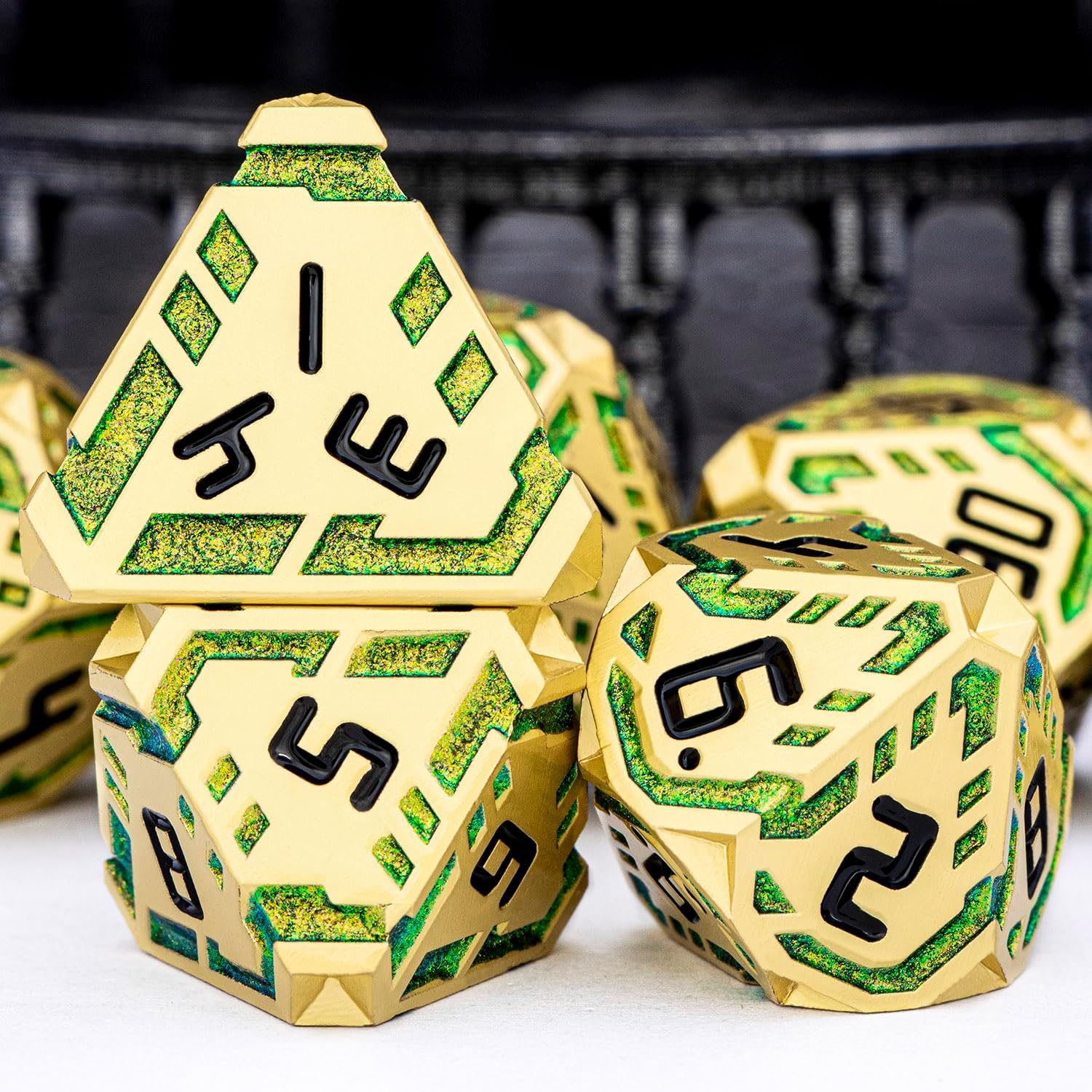 Metal DND Sci-fi Dice Set 7PCS Stripe Polyhedral Dice for Dungeons Dragons RPG Role Playing Game, Glitter D and D Dice with Gift Box D6 D8 D10 D12 D20 (Golden Green)