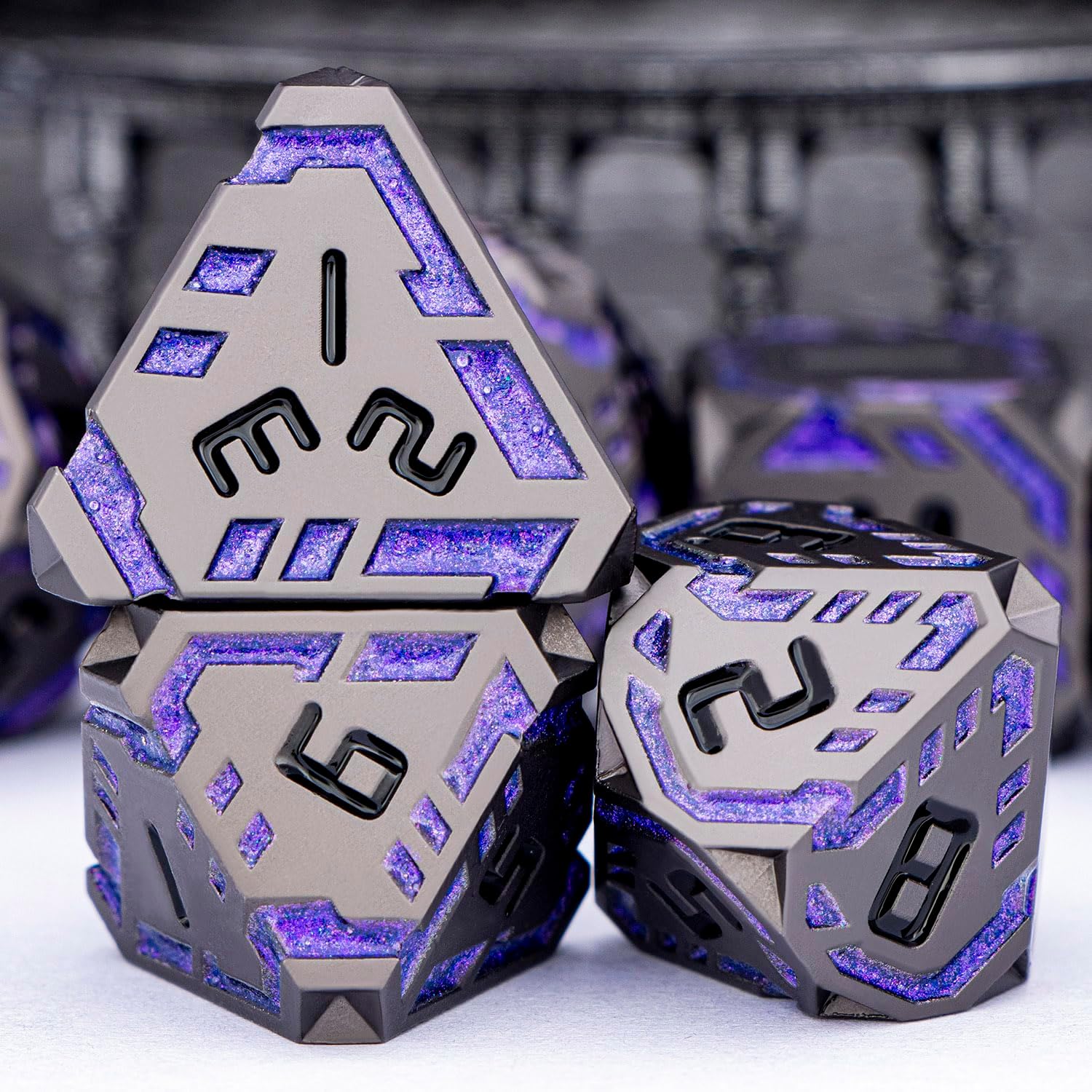 Metal DND Sci-fi Dice Set 7PCS Stripe Polyhedral Dice for Dungeons Dragons RPG Role Playing Game, Glitter D and D Dice with Gift Box D6 D8 D10 D12 D20 (Black Purple)