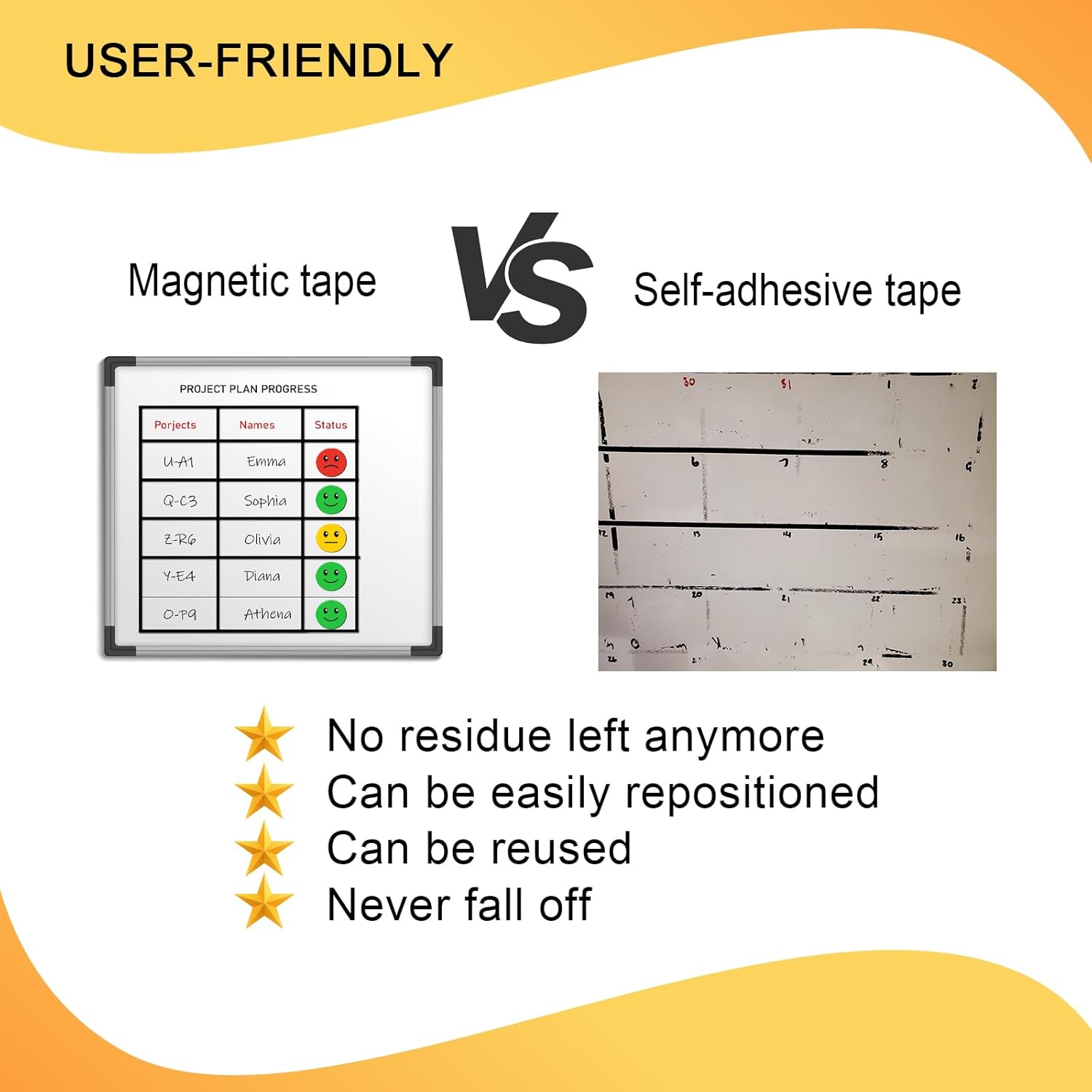 - Easy to Use: Compared to Self-Adhesive Vinyl Tape, Magnetic strips can be reused and adjusted to any position without leaving any residue on the white board