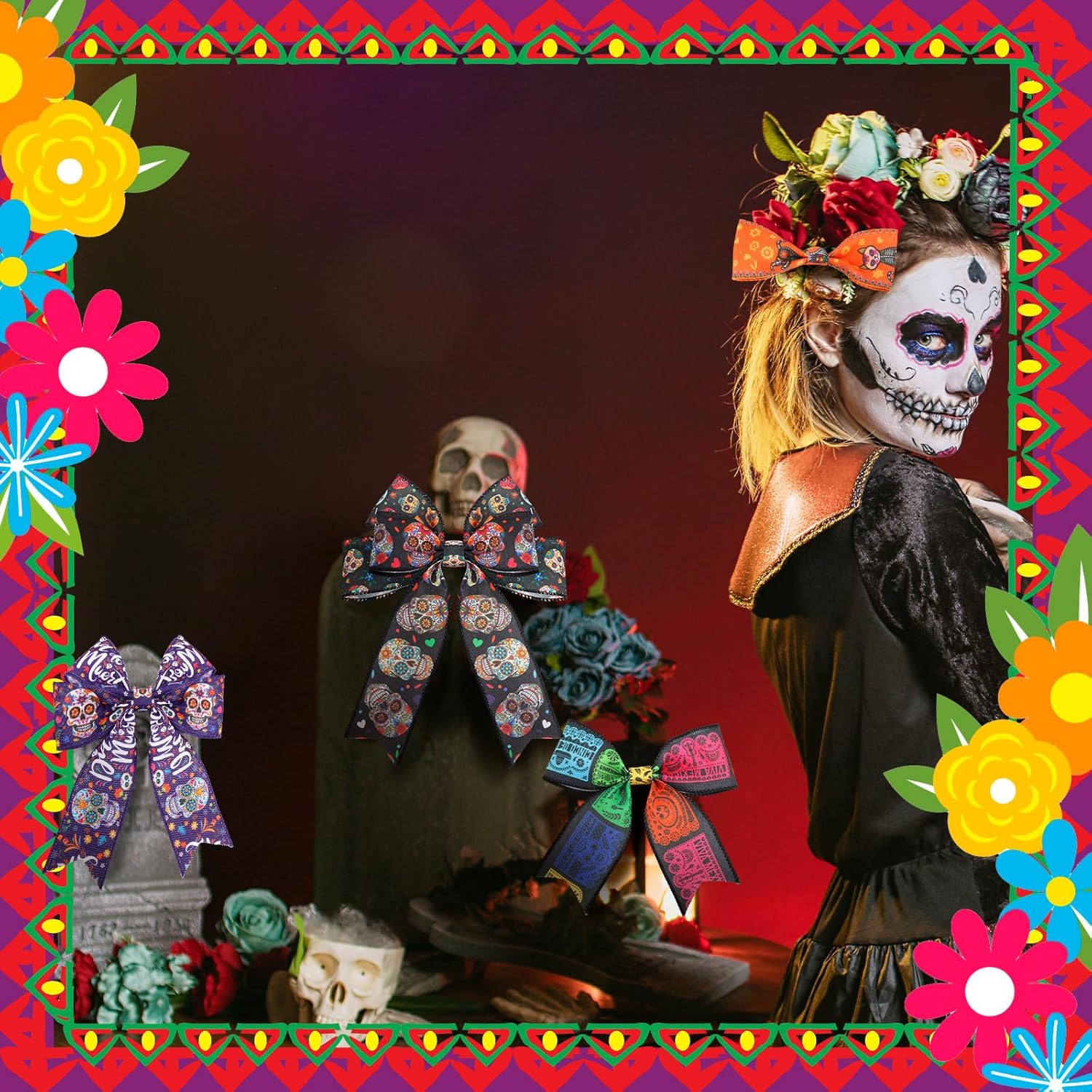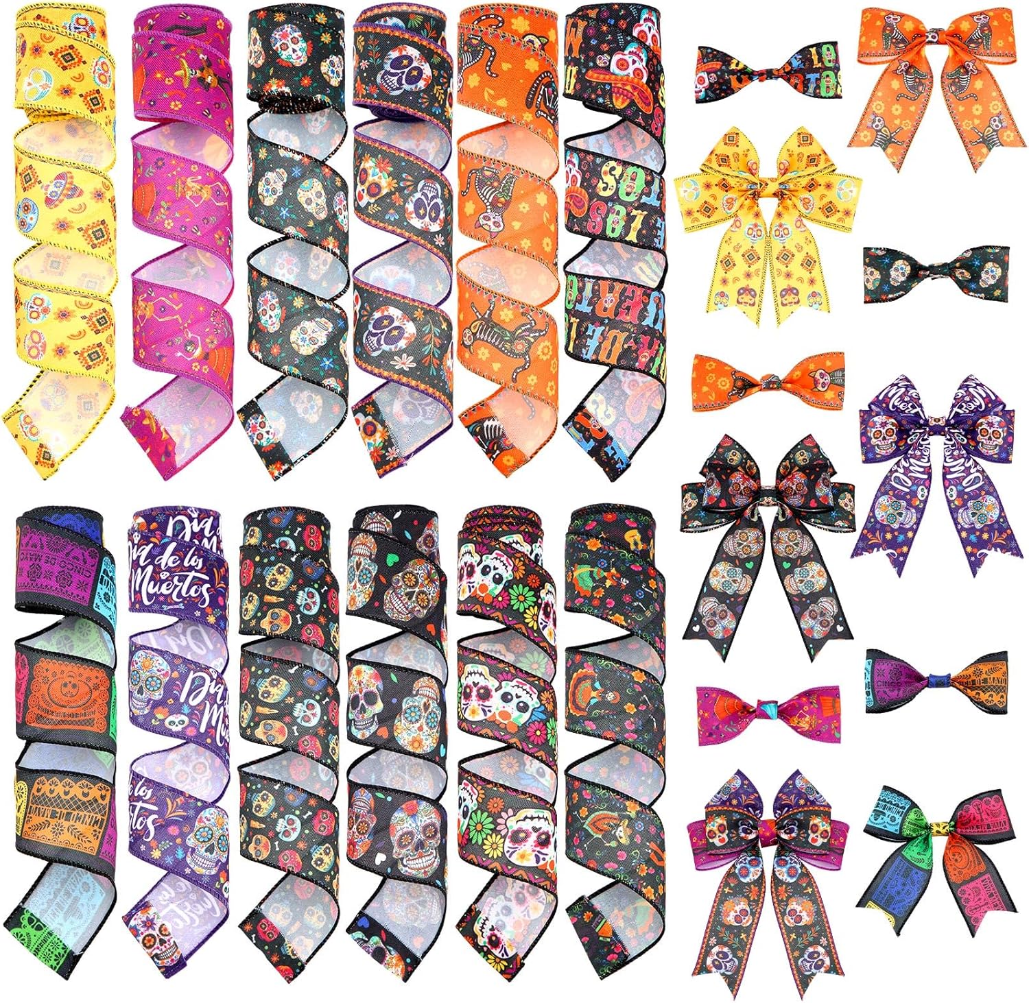 - Day of The Dead in Every Design: our wired edge ribbons for wreaths boast Halloween elements, including sugar skulls, Calendula, skeleton man playing the guitar, dancing skeleton women in dress and more; These vibrant and festive designs will add a touch of Day of The Dead to art projects or decoration, bringing the spooky spirit of Day of The Dead into your craft