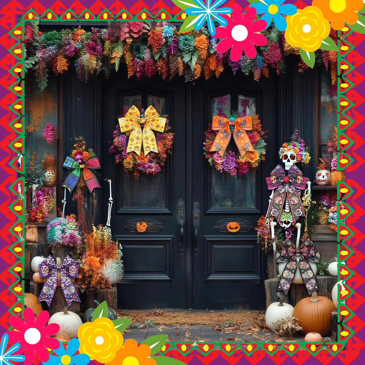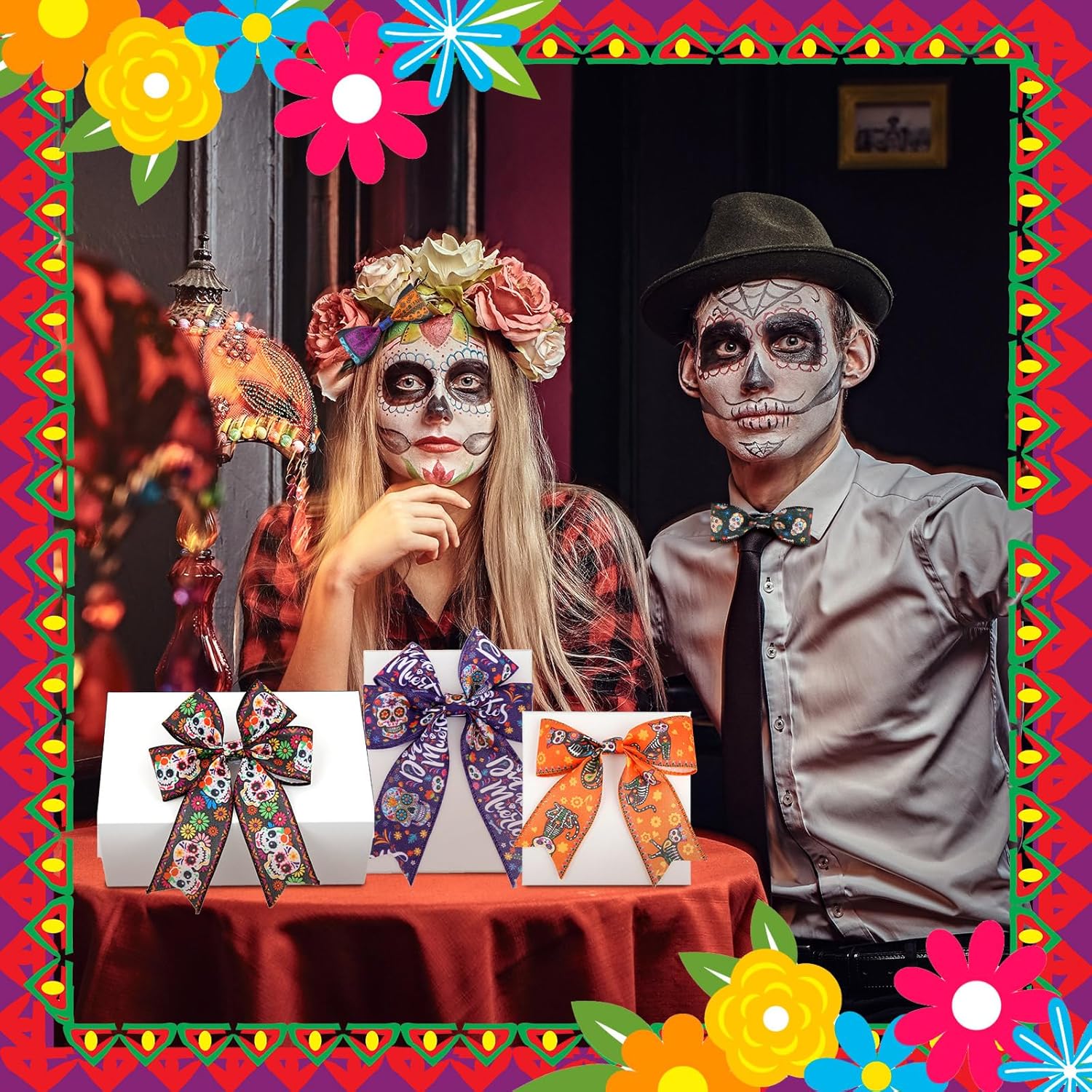 - Create a Day of The Dead Table Festive Spirit: our wired ribbon is the delicate accessory to elevate your Day of The Dead decorations; Whether you're adorning your front door, staircase, tables, stairs, railings, candles, lights, trees or even creating your own Day of The Dead inspired centerpieces, our ribbon will add a festive touch to many spaces