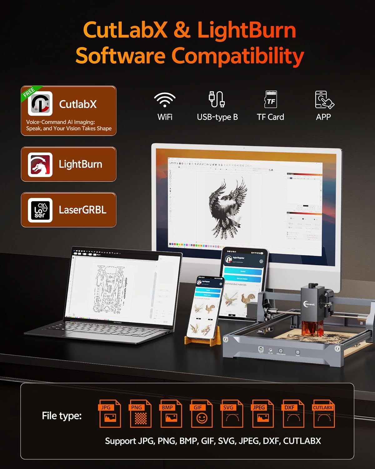 - User-Friendly, No Hidden Costs: Includes our CutLabX app (works with Windows, Mac, Android, iOS) with no subscription fees, plus compatibility with LightBurn and LaserGRBL. The beginner-friendly starter kit comes with safety glasses, test materials, and tools, with 90-second setup (just 6 screws, no tedious belts).