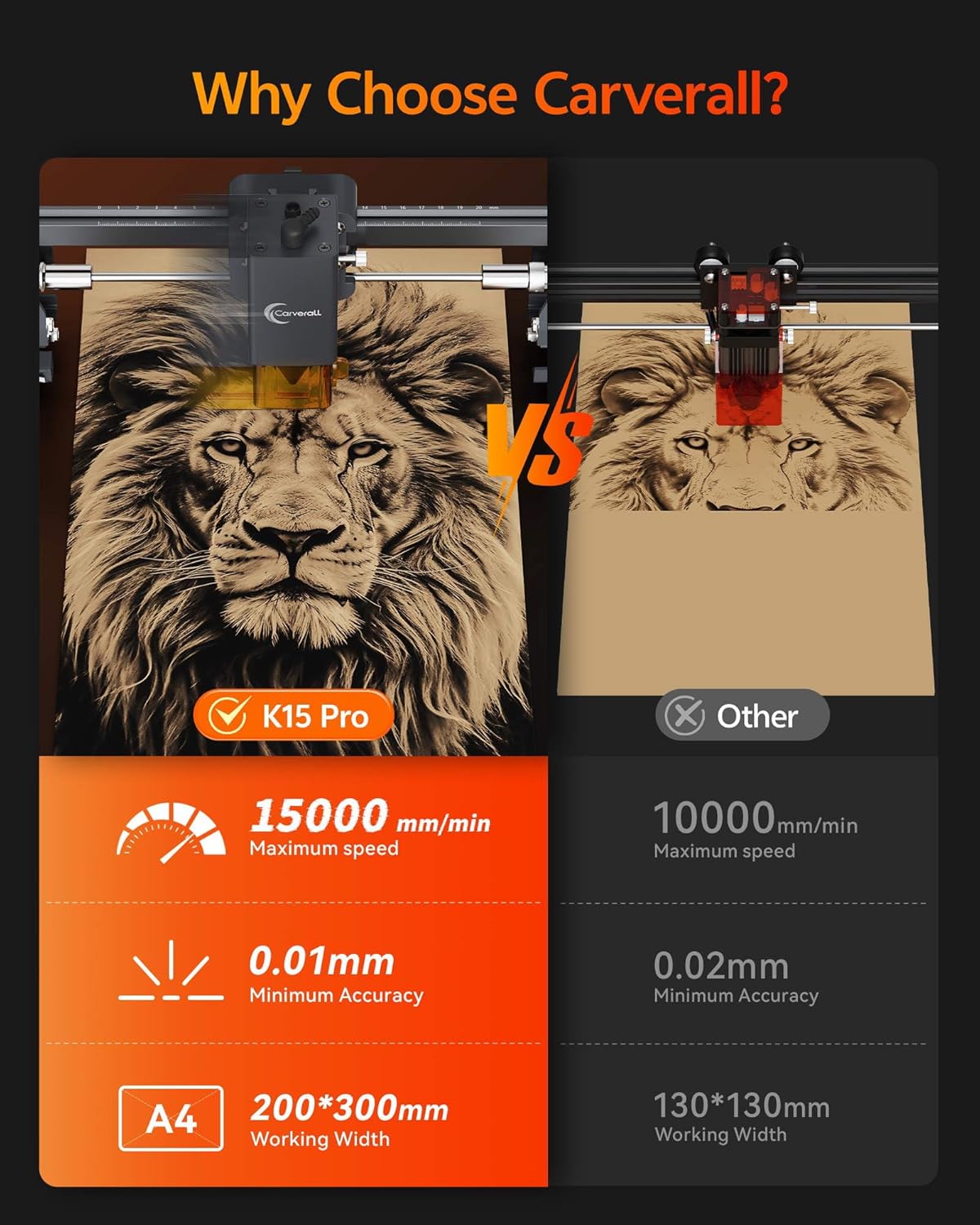 - Professional-Grade Precision & Speed: The Carverall K15 Pro laser engraver machine combines 0.01mm precision (outperforming standard 0.1mm models) with a 15,000mm/s min engraving speed—ideal for jewelry, custom gifts, and DIY crafts where detail and efficiency matter.