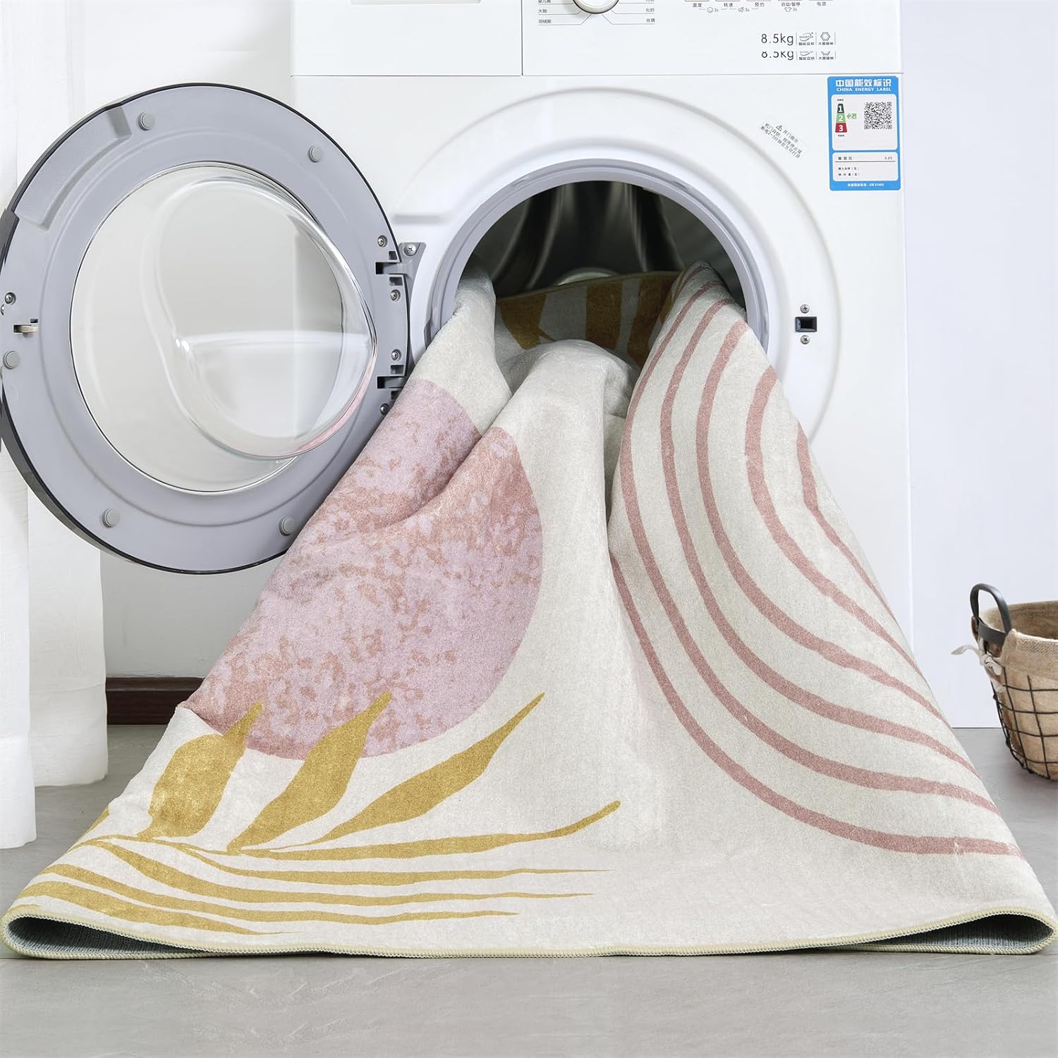 RoomTalks Cute Pink Nuresry Rug Washable, Boho Modern Contemporary Aesthetic 4x6 Area Rugs for Bedroom Dining Living Room Dorm, Abstract Art Tropical Leaves Thin Indoor Entryway Rug Carpet