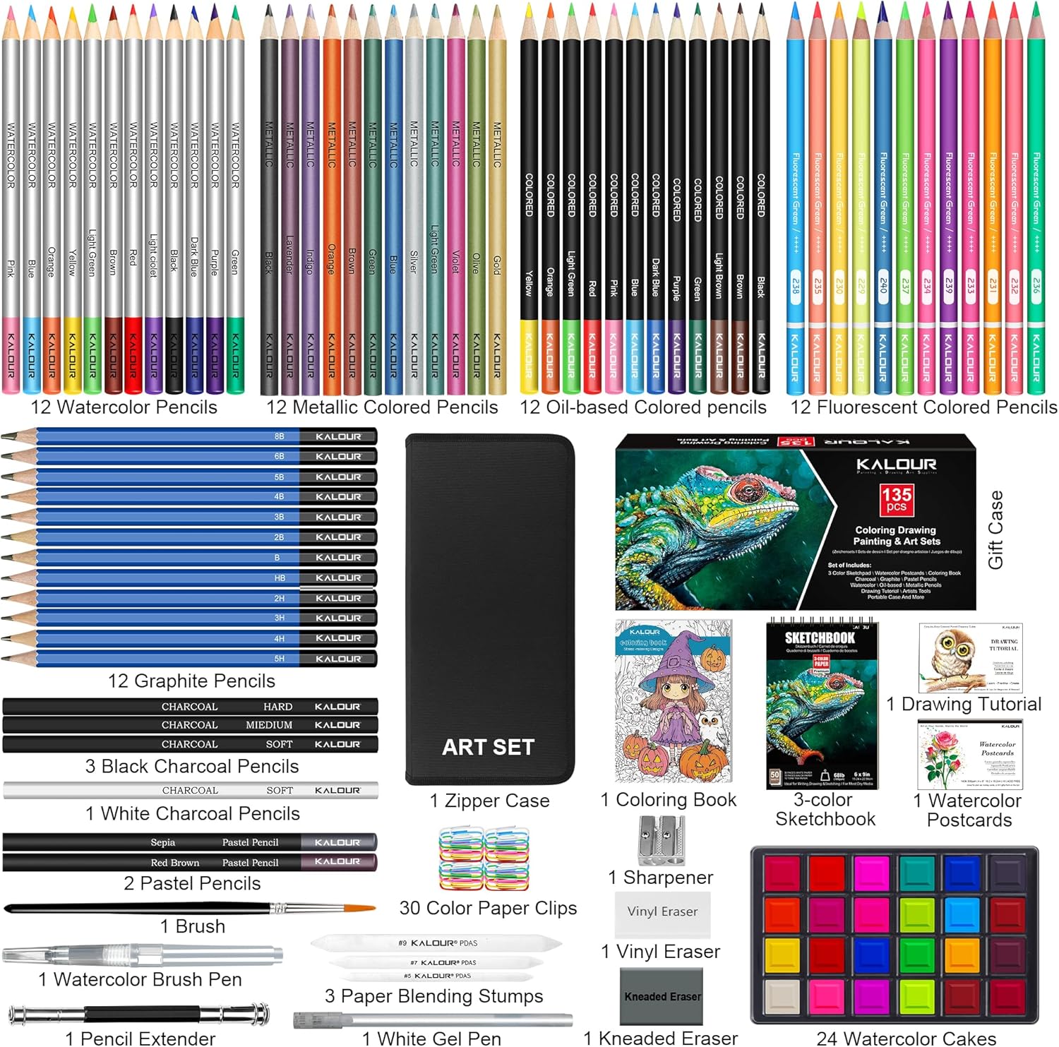 KALOUR 135 Drawing Set Sketching Kit,Art Supplies with 3-color Sketchbook & Coloring Paper,Include Tutorial, Oil Based, Neon,Graphite, Charcoal, Watercolor & Metallic Pencil,for Artist Adults Beginner