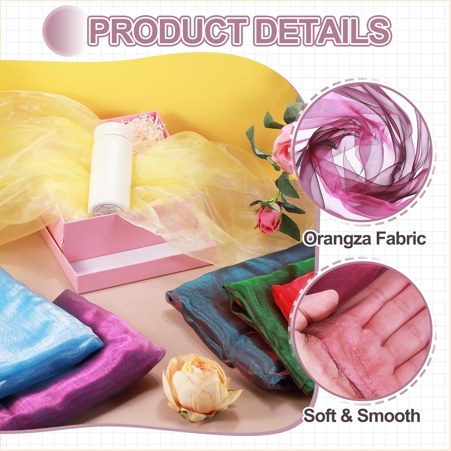 - Elevate your creative vision with this iridescent organza fabric, blending functionality and elegant beauty. Perfect for bridal wear, home decoration, curtains, table runners, event backdrops, floral arrangements, and DIY crafts.