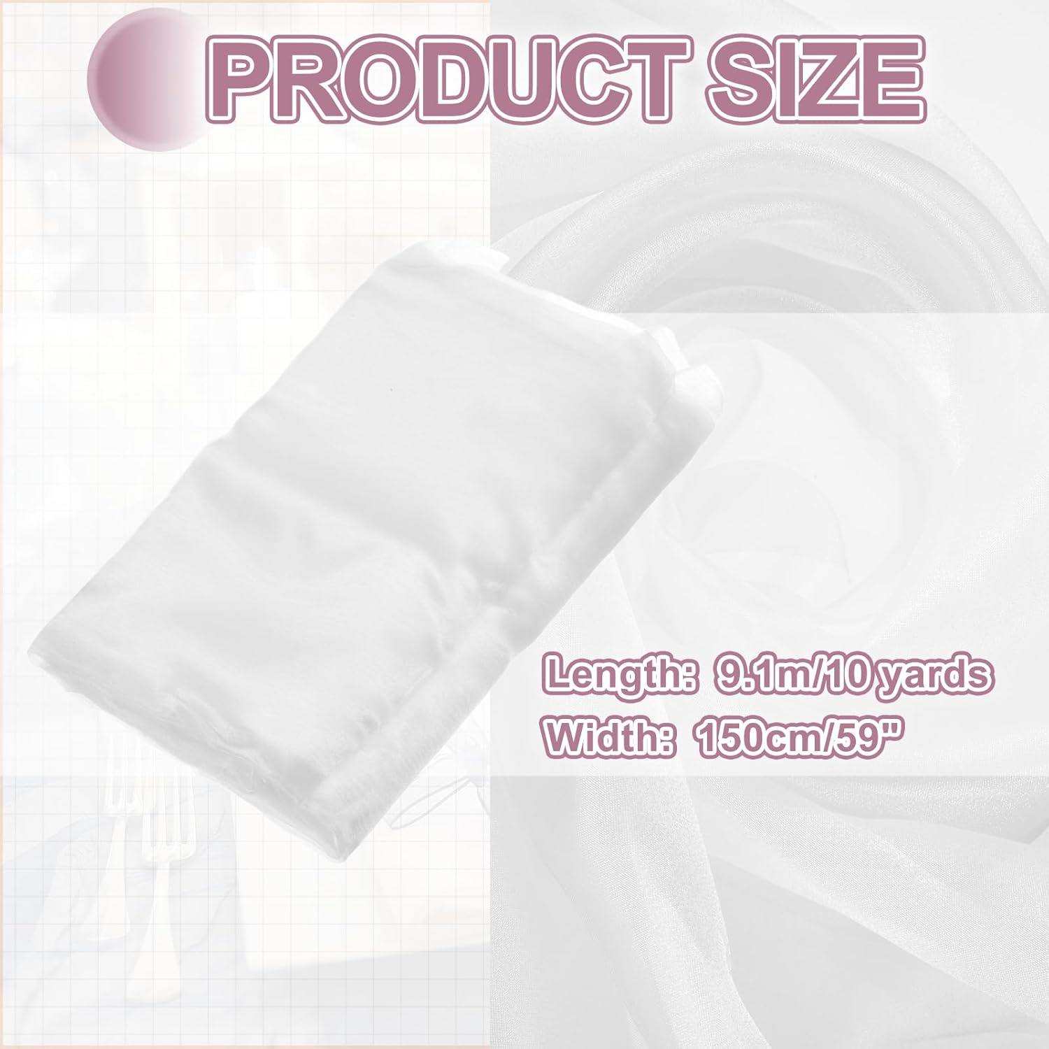 - The organza fabric is in the size of 10 yards x 59 inches/ 9.1m x 150cm (LxW), providing ample fabric for large-scale designs, making it good for wedding dresses, curtains, or event installations.
