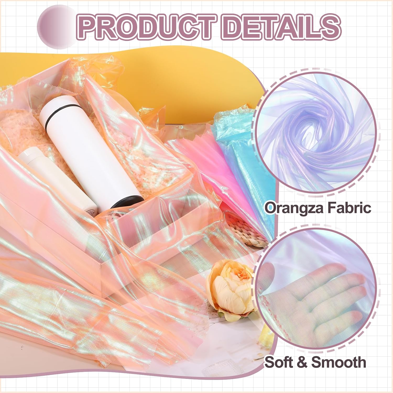 - Elevate your creative vision with this iridescent organza fabric, blending functionality and elegant beauty. Perfect for bridal wear, home decoration, curtains, table runners, event backdrops, floral arrangements, and DIY crafts.