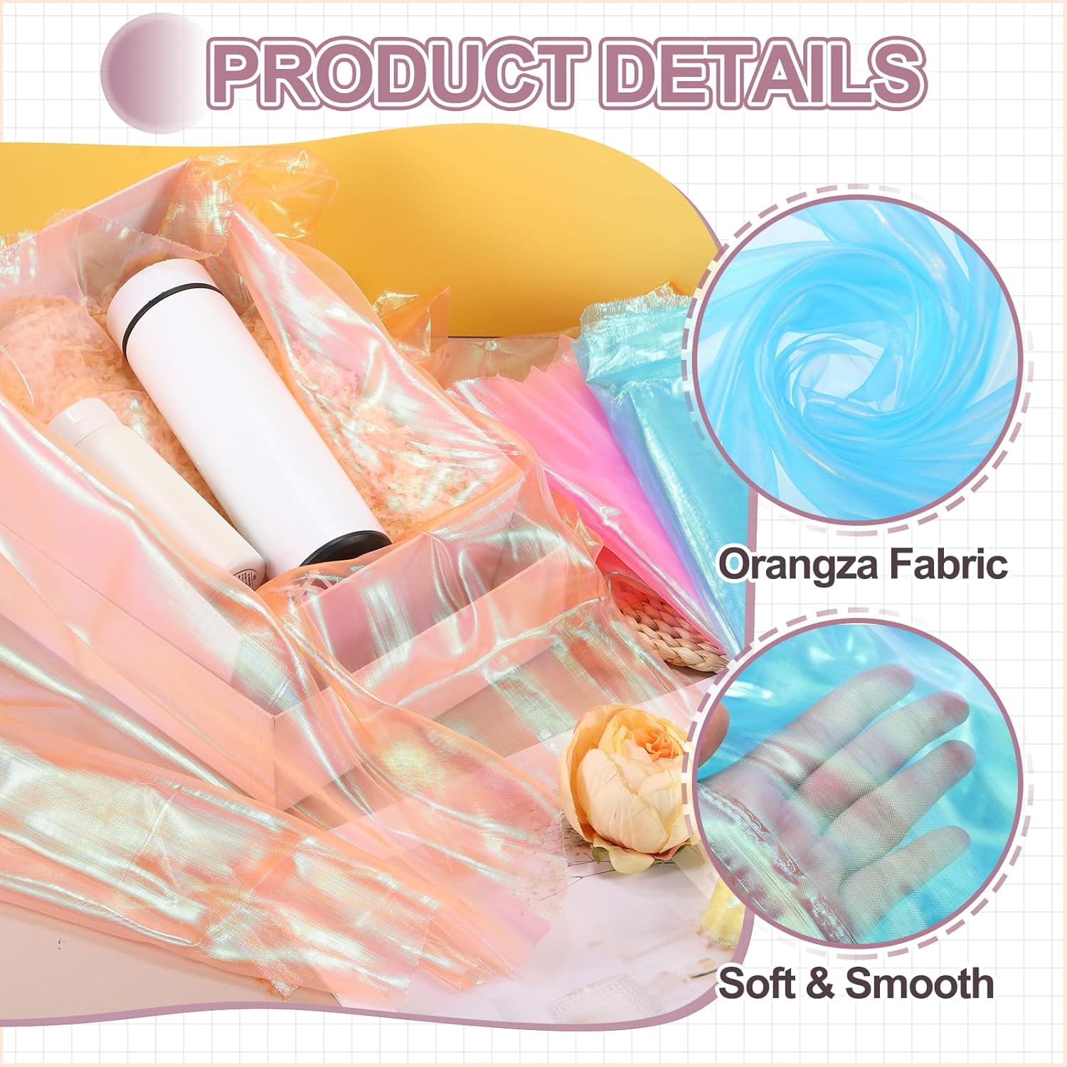 - Elevate your creative vision with this iridescent organza fabric, blending functionality and elegant beauty. Perfect for bridal wear, home decoration, curtains, table runners, event backdrops, floral arrangements, and DIY crafts.