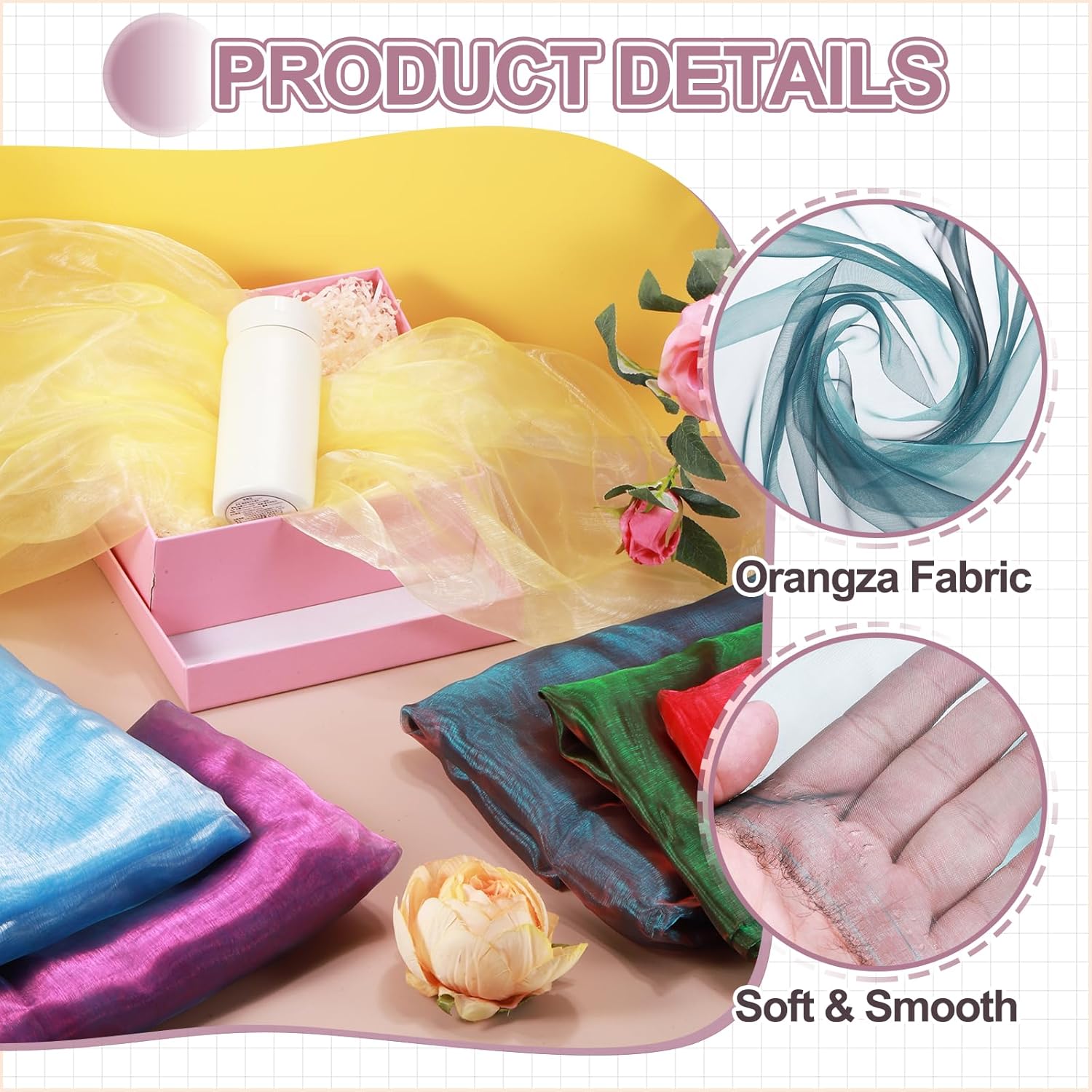 - Elevate your creative vision with this iridescent organza fabric, blending functionality and elegant beauty. Perfect for bridal wear, home decoration, curtains, table runners, event backdrops, floral arrangements, and DIY crafts.