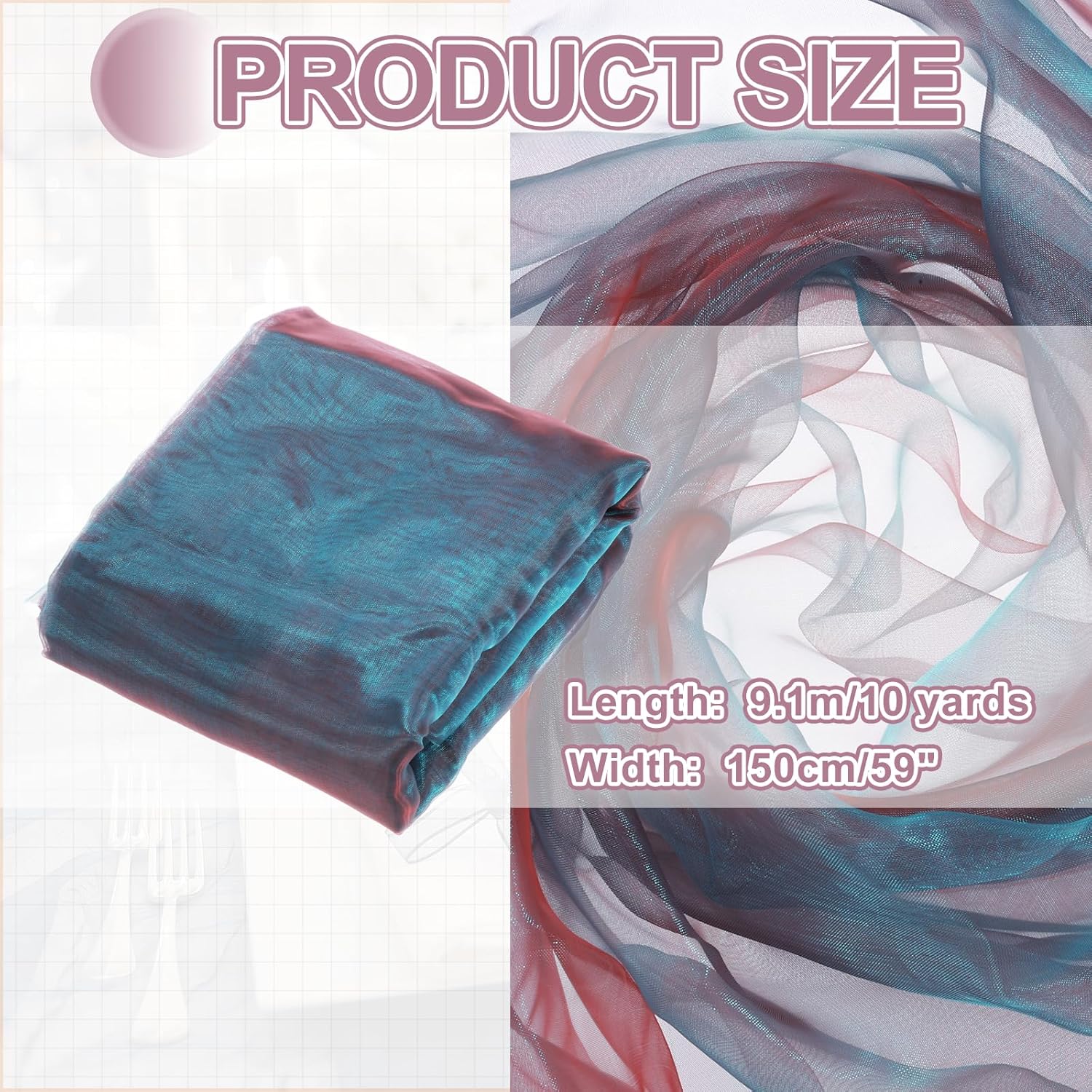 - The organza fabric is in the size of 10 yards x 59 inches/ 9.1m x 150cm (LxW), providing ample fabric for large-scale designs, making it good for wedding dresses, curtains, or event installations.
