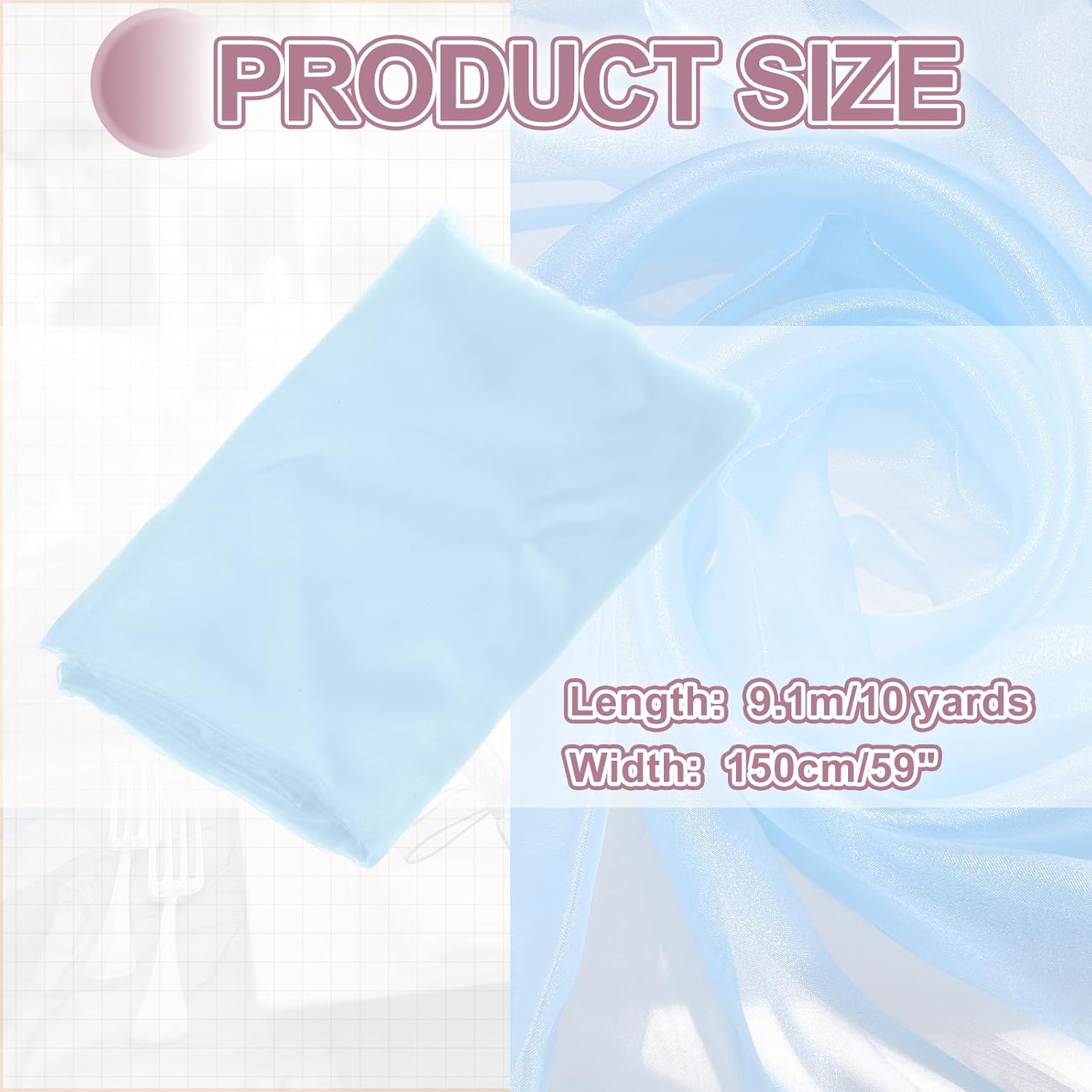 - The organza fabric is in the size of 10 yards x 59 inches/ 9.1m x 150cm (LxW), providing ample fabric for large-scale designs, making it good for wedding dresses, curtains, or event installations.