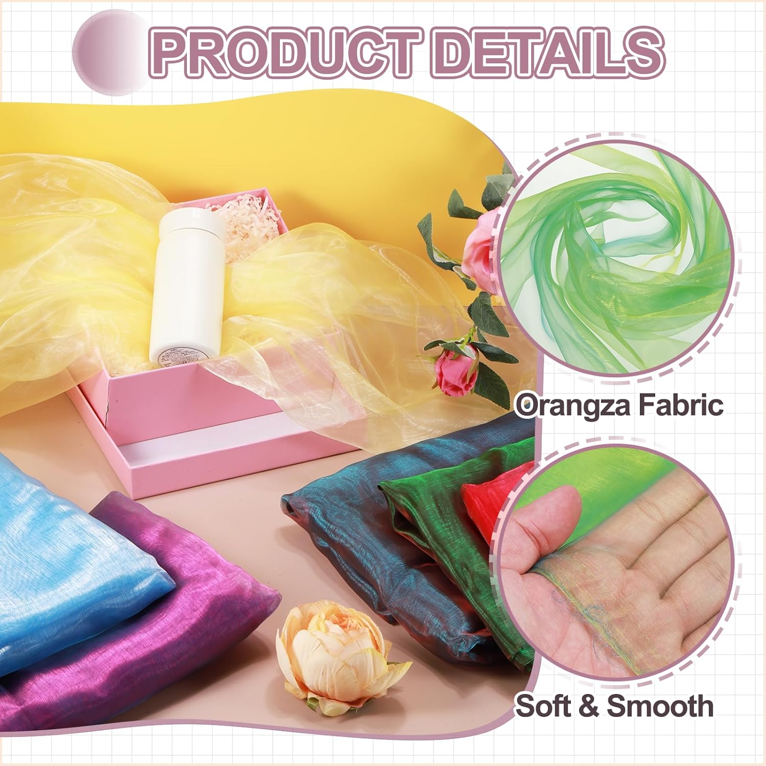 - Elevate your creative vision with this iridescent organza fabric, blending functionality and elegant beauty. Perfect for bridal wear, home decoration, curtains, table runners, event backdrops, floral arrangements, and DIY crafts.