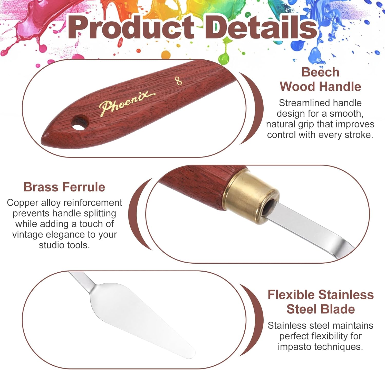 - Painting Knife, Total Length: 19.8cm/7.8 inch; Knife Size:53x18mm/2.09x0.71inch(L*W); Model No.: No.8; Style: Pointed Handle with Notched Base & Hanging Hole; Knife Material: Stainless Steel; Handle Material: Beech Wood; Handle Color: Mahogany Finish; Package Contents: 1 Pcs x Palette Knife