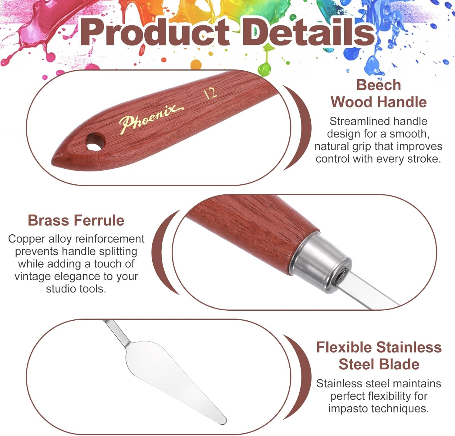 - Painting Knife, Total Length: 21.6cm/8.5 inch; Knife Size:71x23mm/2.8x0.91inch(L*W); Model No.: No.12; Style: Pointed Handle with Notched Base & Hanging Hole; Knife Material: Stainless Steel; Handle Material: Beech Wood; Handle Color: Mahogany Finish; Package Contents: 1 Pcs x Palette Knife