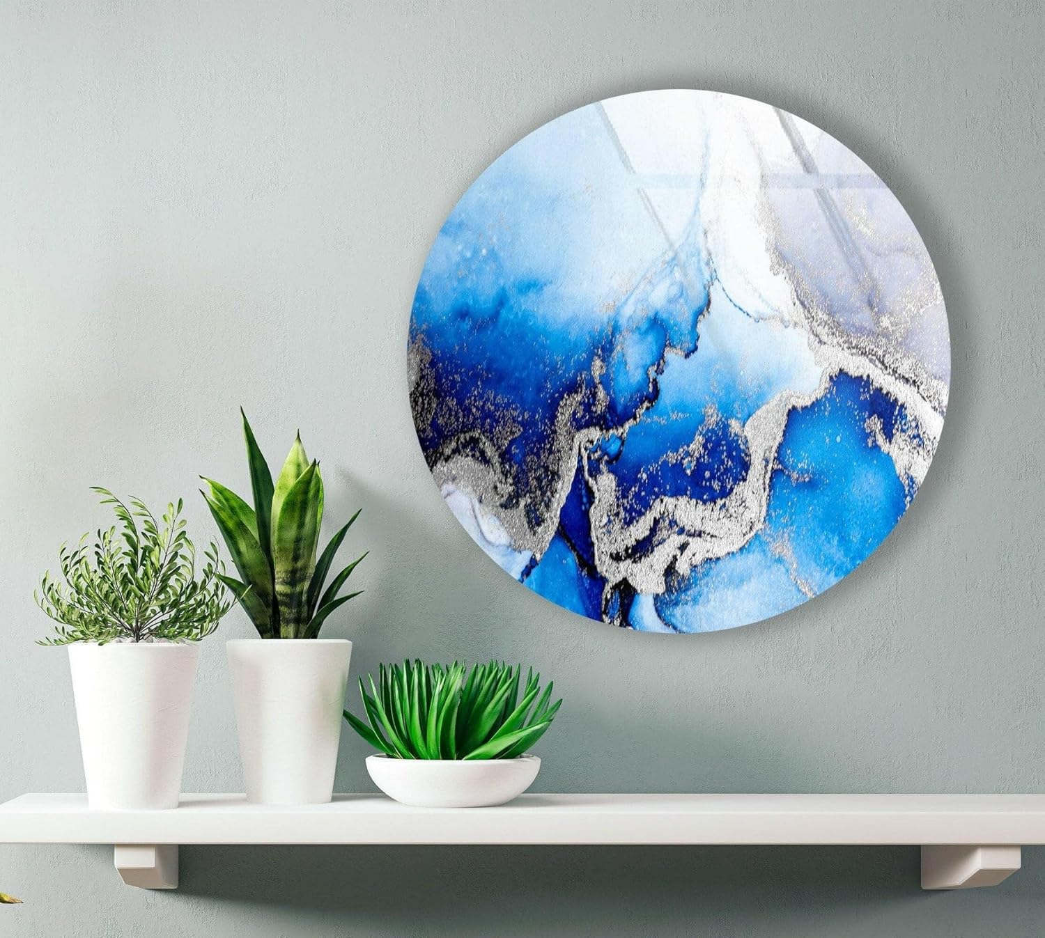 My Photostation.com 15.8''(40cm) Diameter Blue Marble Round with Silver Details Glass Wall Art Tempered Glass Printing Wall Decor Large Wall Art Wall Hangings