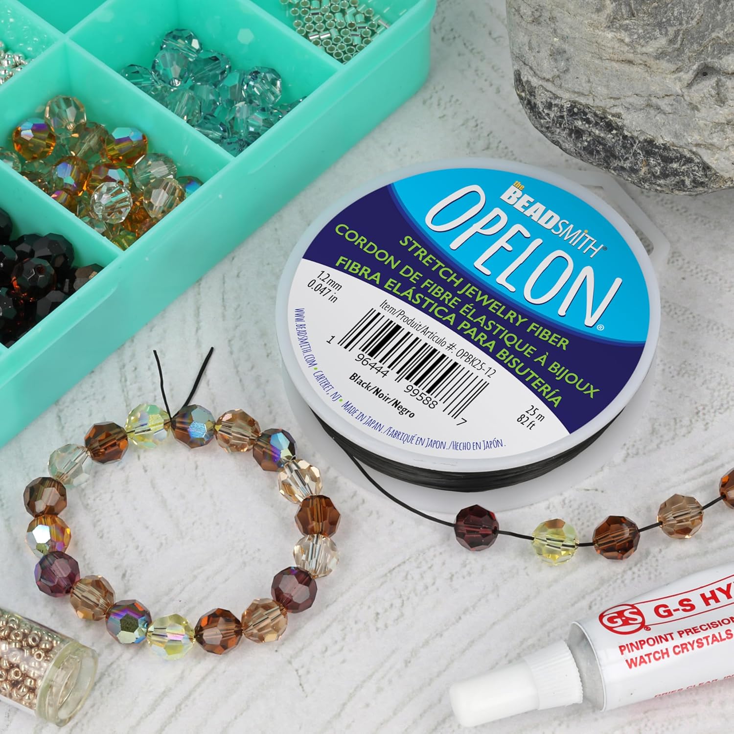 - OPELON FIBER: This stretchy jewelry string is made of a black fibrous material and measures 1.2 mm in diameter. The 25 meters are wound on a spool that is secured with a clear plastic clip to keep your cord secure and organized.