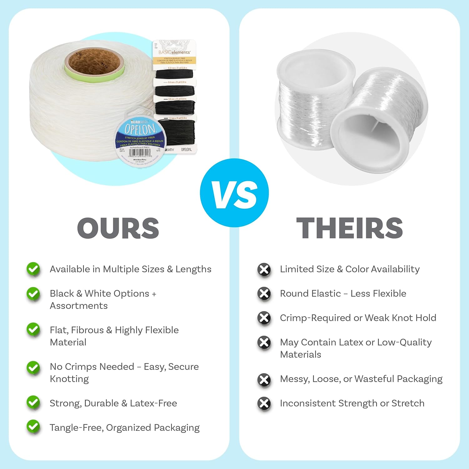 - FLEXIBLE MATERIAL: Opelon is a flat fibrous cord with impressive stretch and resiliency. This latex-free material is strong, easy to knot, and doesn’t require crimps. Its flat shape makes it more flexible than traditional stretch cords and it maintains its elasticity over time.