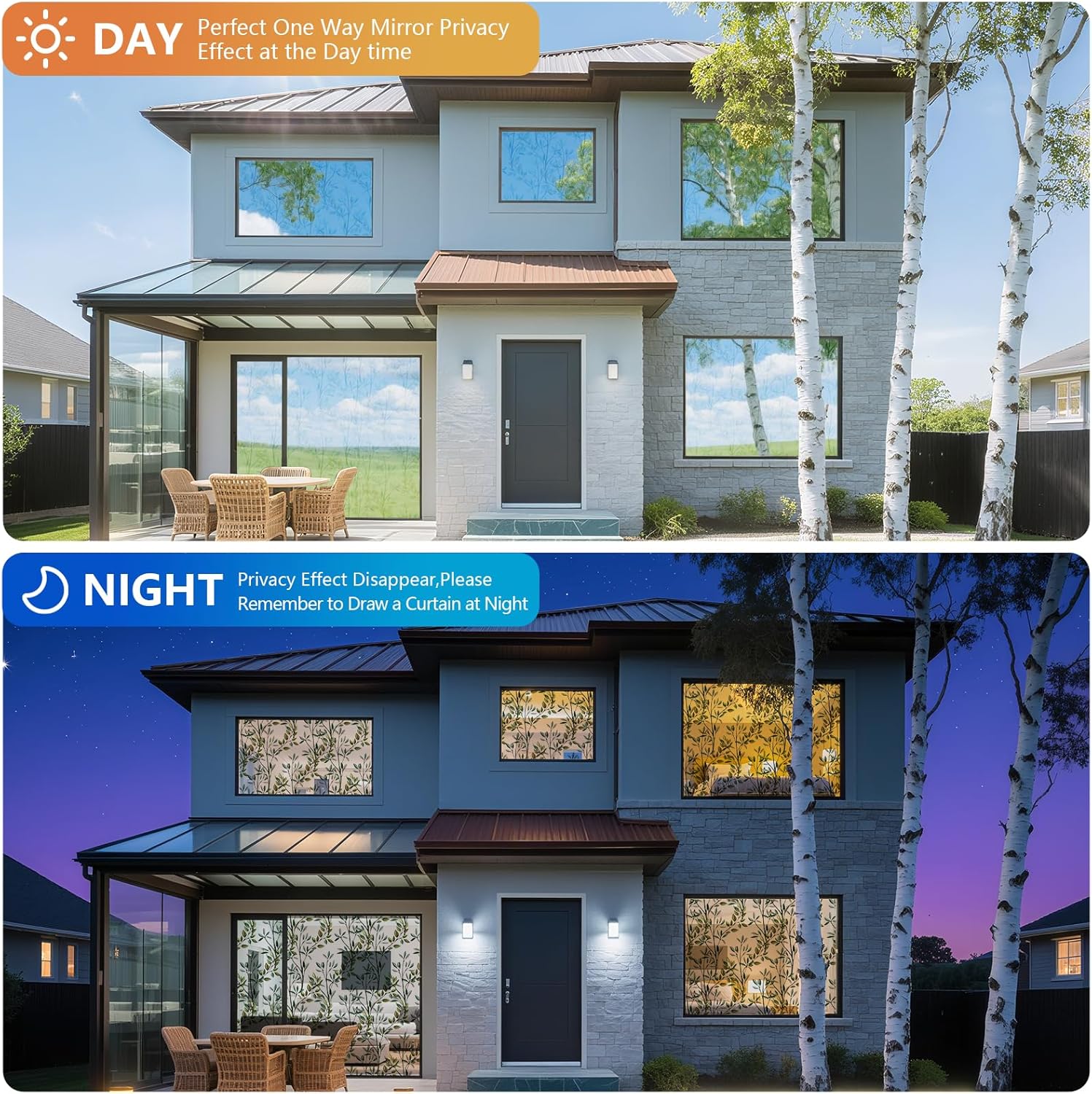 - Day and Night Privacy Protection: Provides excellent privacy during daytime through mirror-like reflection. At night, when indoor lighting is stronger, the mirror effect decreases; using curtains is recommended for full privacy protection.